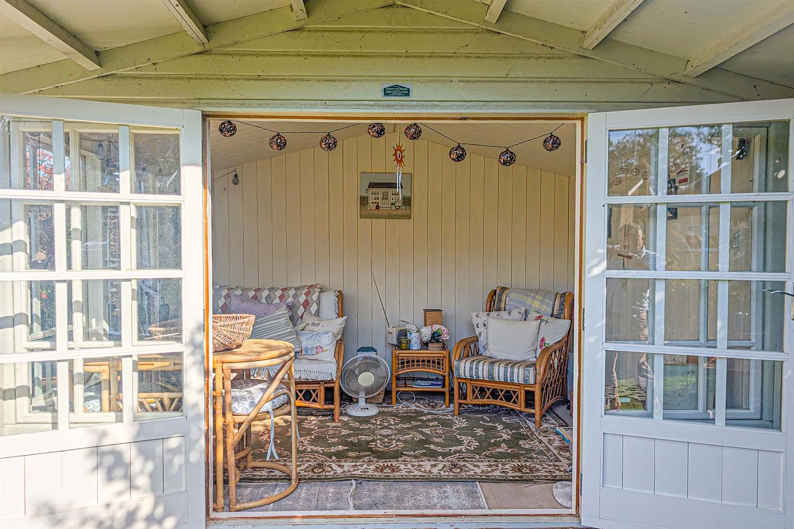 Patio area to the rear of the house with French doors leading to the sitting room and door leading to the kitchen. Mainly laid to lawn with a charming variety of established planting. Further raised patio area at the rear with a delightful summer house. Access gate to the front.