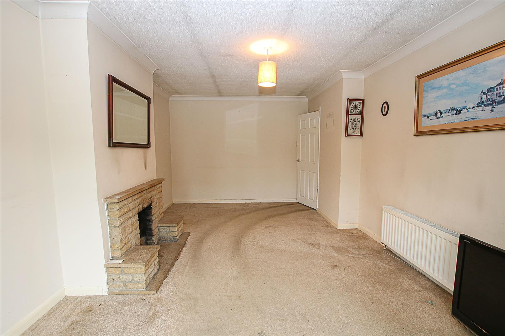 Spacious living room with featured open fireplace and bricked surroundings, radiator and window to the front aspect.