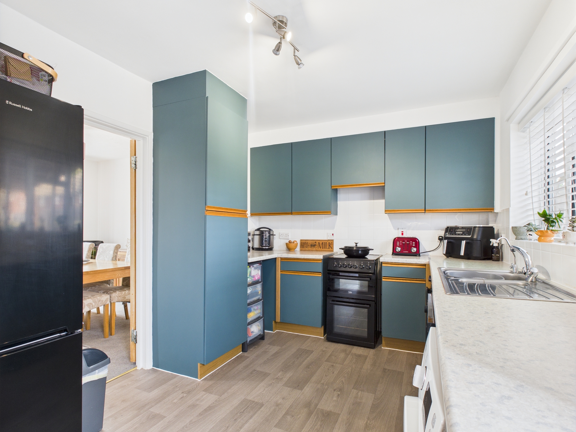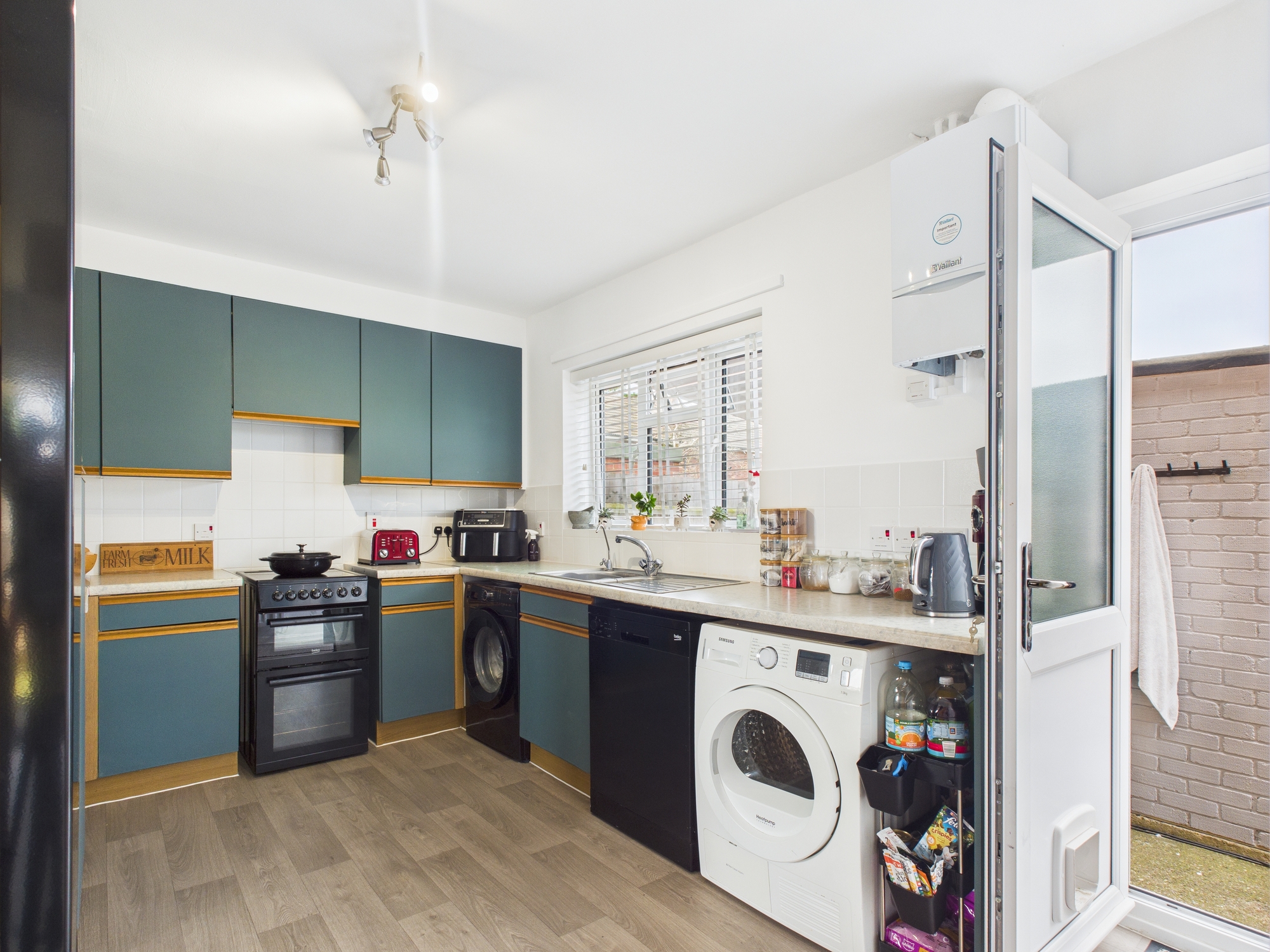 uPVC double glazed window to rear, uPVC double glazed door to rear garden, wall mounted double panel radiator, wall and base units under round edge worksurfaces, 1 1/2 stainless steel sink drainer with mixer tap over, space for free standing oven and hob, space for washing machine, space for tumble drier, space for dishwasher, space for fridge/freezer, lino style flooring, wall mounted gas central heating boiler.