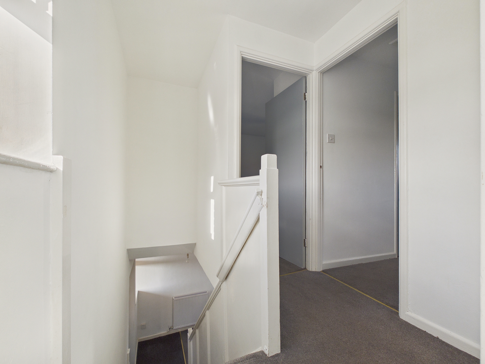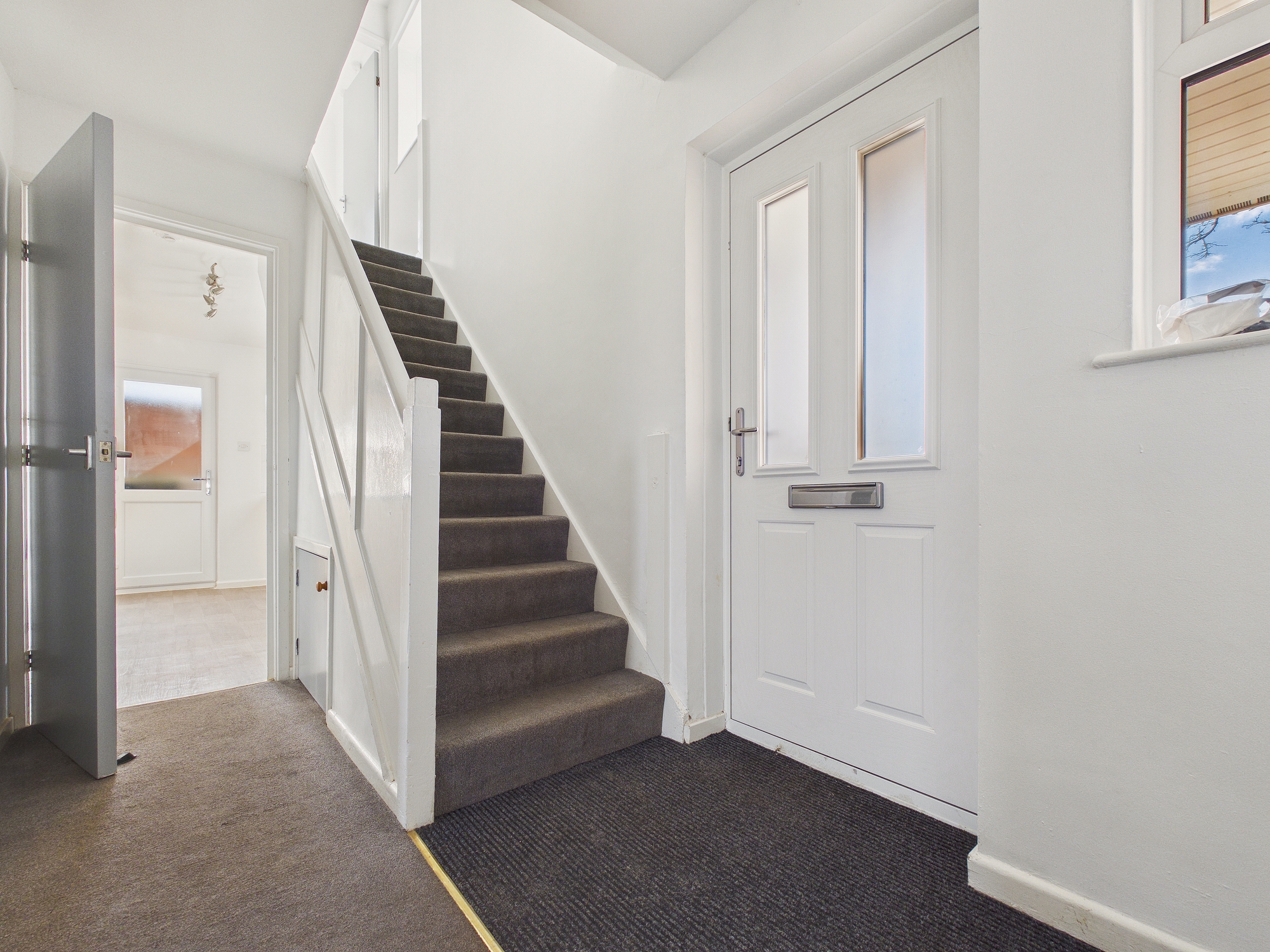 Wall mounted double panel radiator, stairs to first floor with storage cupboard under, door to storage cupboard, doors to all rooms.