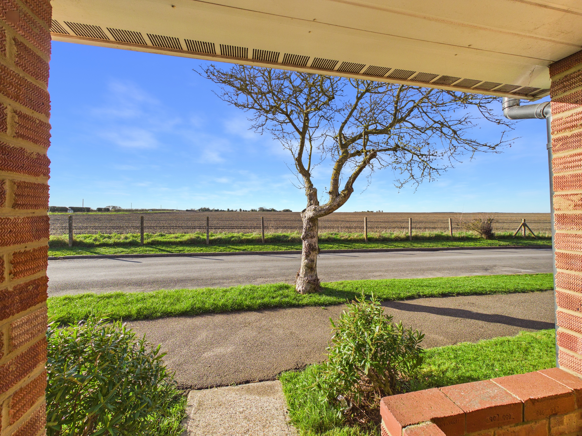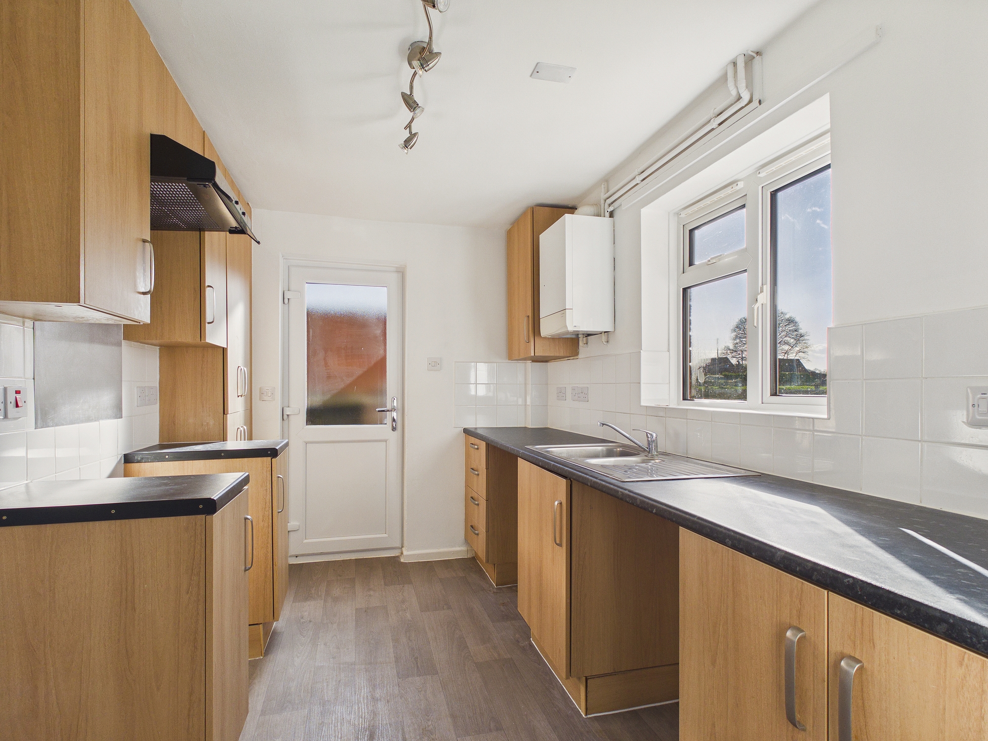 uPVC double glazed window to front with field views, uPVC double glazed door to side, wall and base units under round edge worksurfaces, 1 1/2 stainless steel sink drainer inset and mixer tap, spaces for washing machine, dishwasher, free standing oven/hob, fridge/freezer, lino style flooring, wall mounted gas central heating boiler.