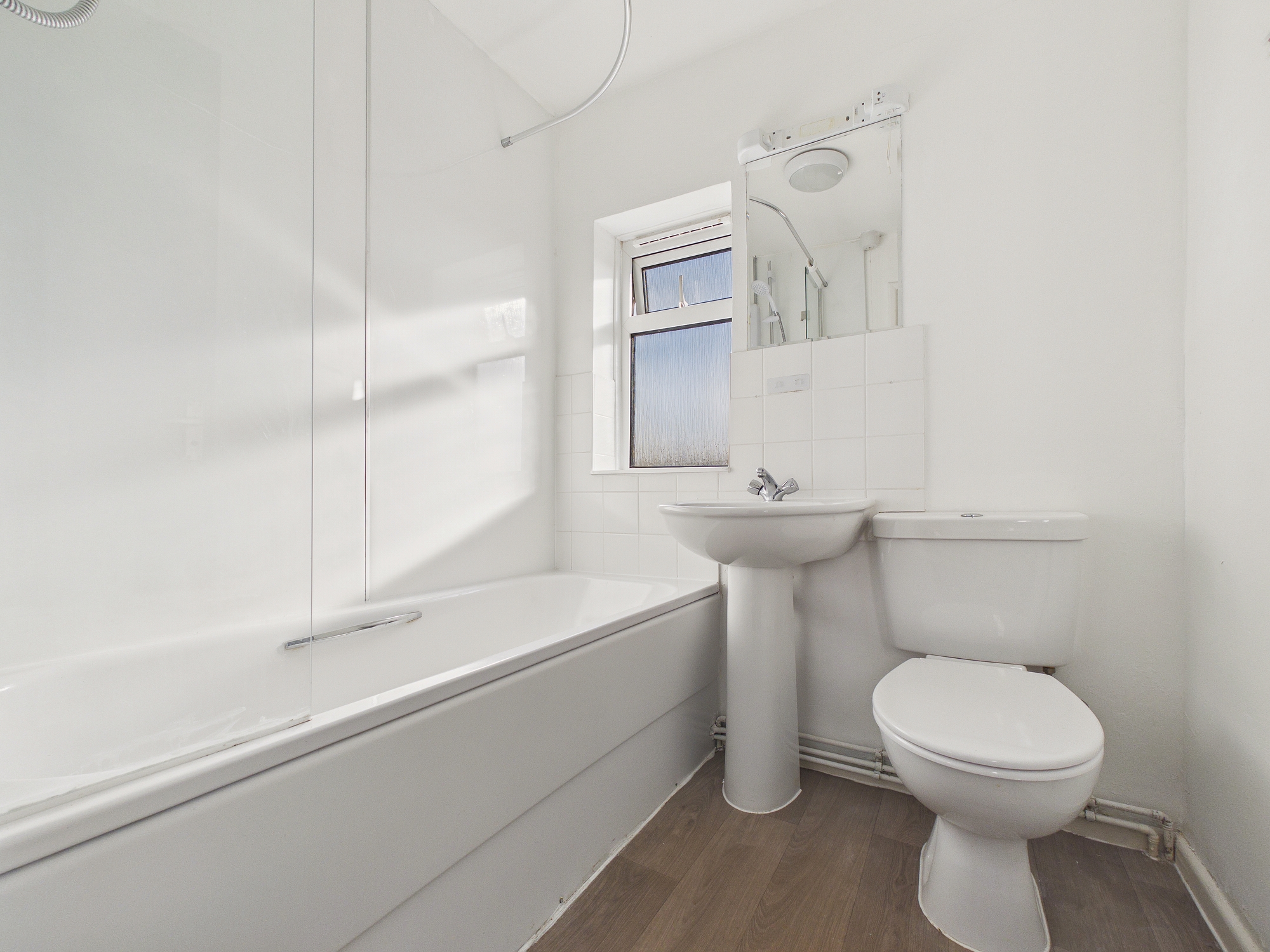 uPVC double glazed windows to front and side, wall mounted single panel radiator, panelled bath with wall mounted shower over, w.c., pedestal handwash basin, lino style flooring, extractor.