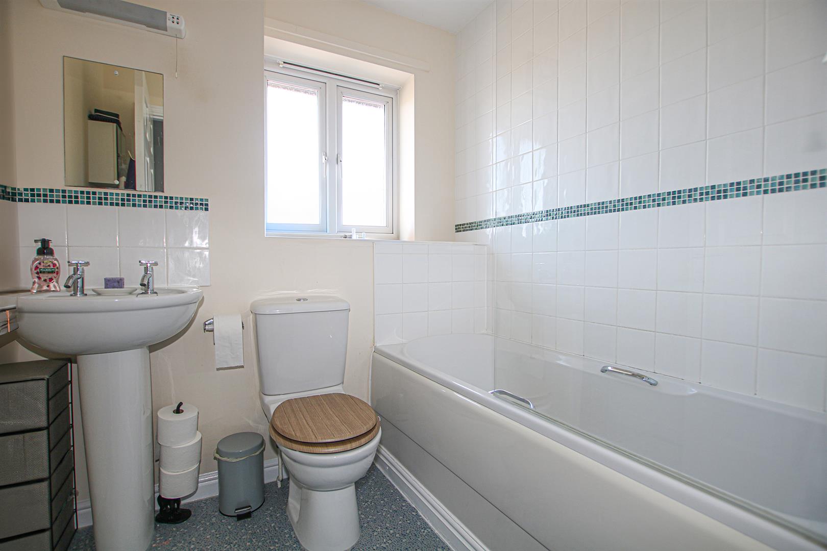Modern white suite comprising low level W.C., pedestal handbasin and panelled bath. Tiled to wet areas. Obscured window. Door to landing.
