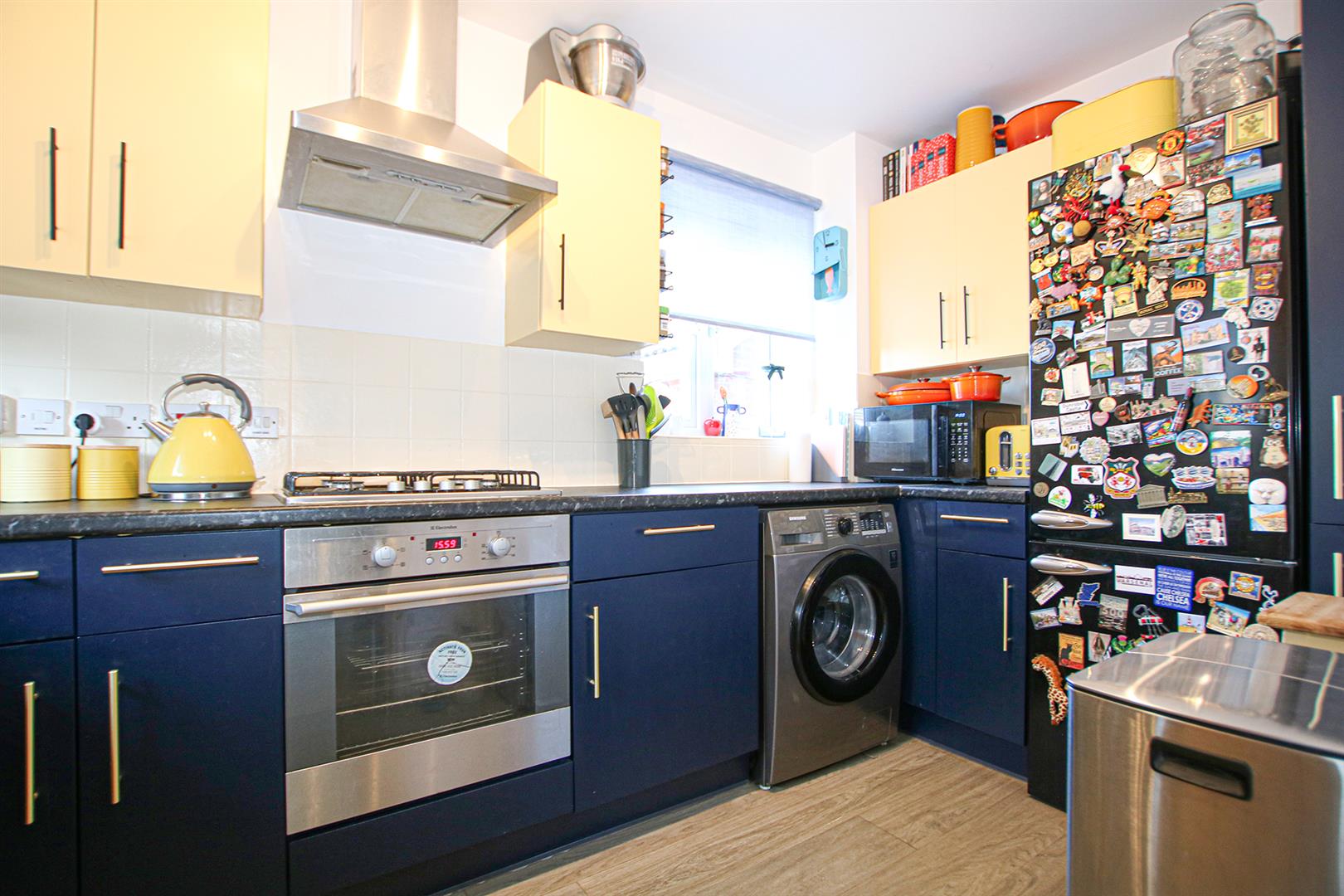 Modern kitchen with a range of eye and base level cupboards with work top over. Stainless steel sink and drainer with mixer tap over. Integrated oven with gas hob and stainless steel extractor above. Space and plumbing for washing machine. Space for fridge/freezer. Tiled splashbacks. LVT wood flooring. Dual aspect windows. Door to entrance hall.
