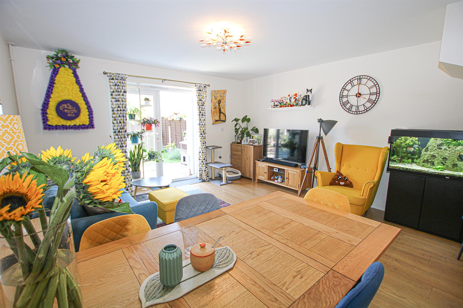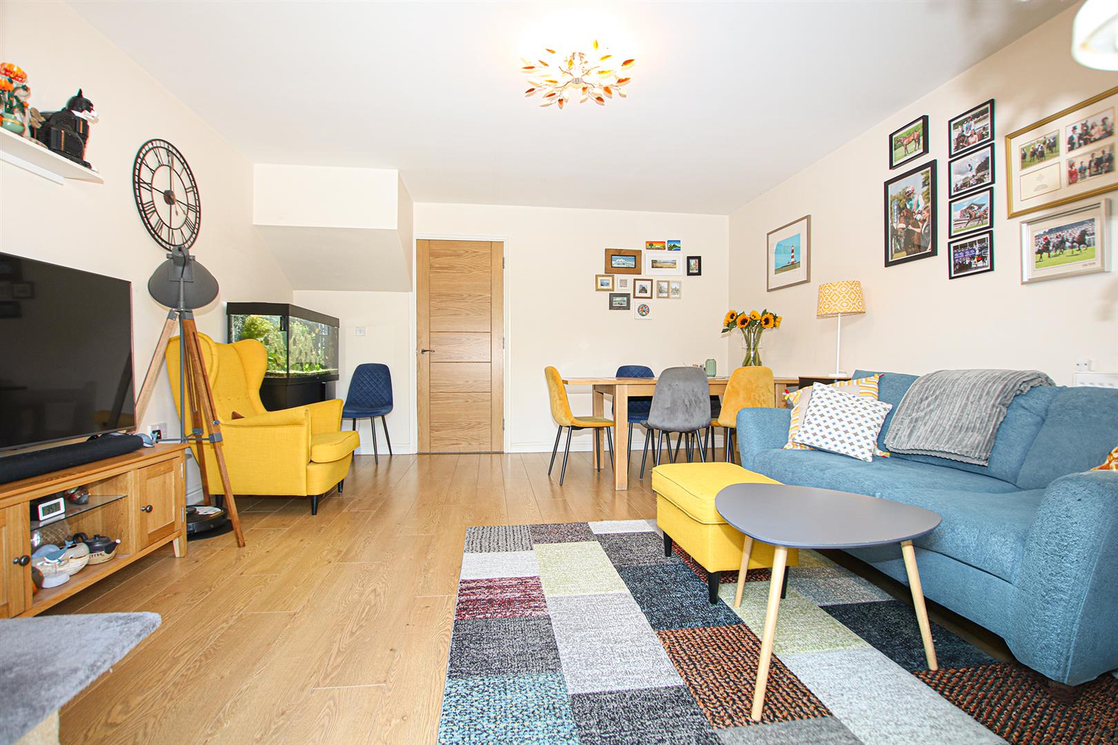 With doors leading to kitchen, living/dining room and cloakroom. Under stair storage cupboard. LVT wood flooring. Stairs leading to first floor.