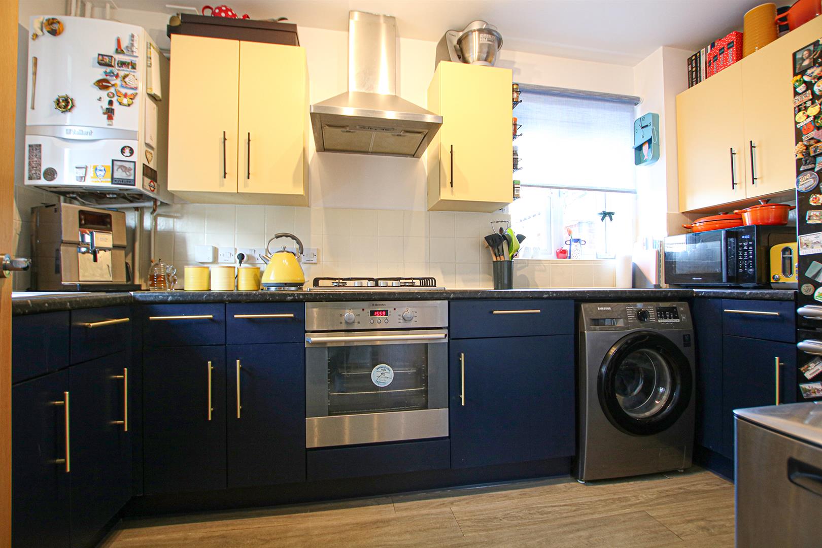 Modern kitchen with a range of eye and base level cupboards with work top over. Stainless steel sink and drainer with mixer tap over. Integrated oven with gas hob and stainless steel extractor above. Space and plumbing for washing machine. Space for fridge/freezer. Tiled splashbacks. LVT wood flooring. Dual aspect windows. Door to entrance hall.