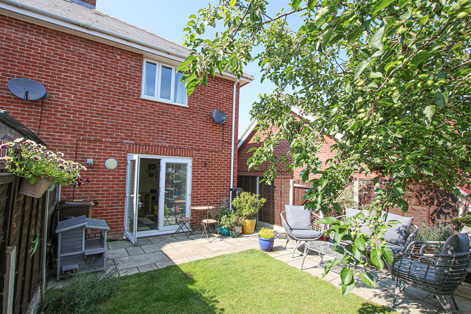 Delightful rear garden with flagstone patio area to the rear of the house, French doors leading to living/dining room. Lawned area with some mature shrub and tree planting. Timber shed. Outside tap. Side access gate.