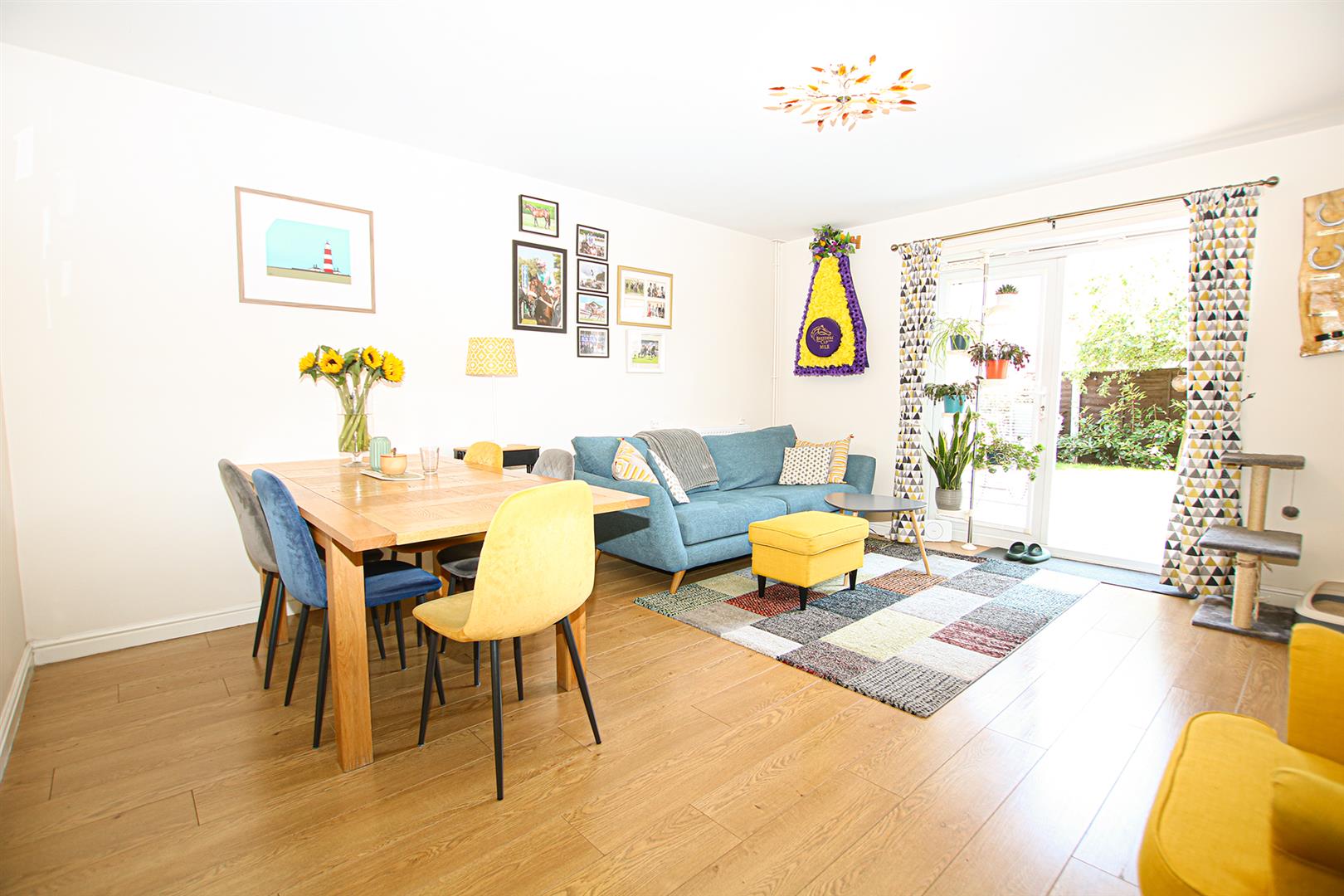 Spacious living/dining room with engineered wood flooring. French doors leading to rear garden. Radiator. Door to entrance hall.