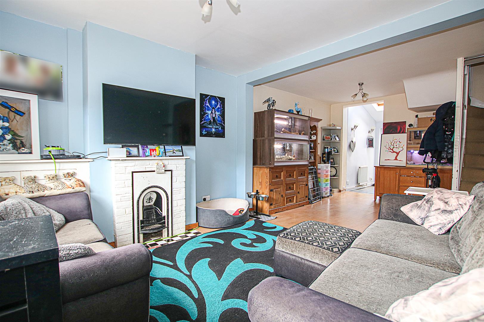 Spacious living room with featured cast iron fireplace, TV connection point, storage cupboards, laid wooden style flooring, radiator, staircase rising to the first floor with storage cupboard under, window to the front aspect and opening through to the: