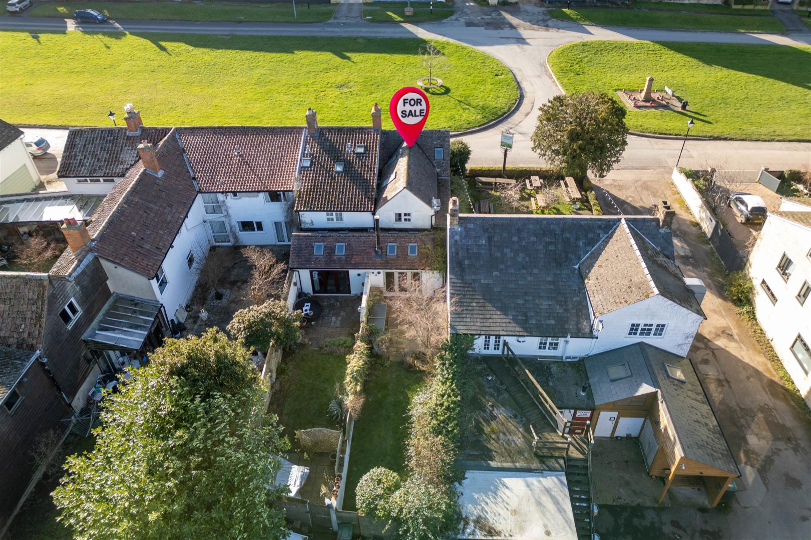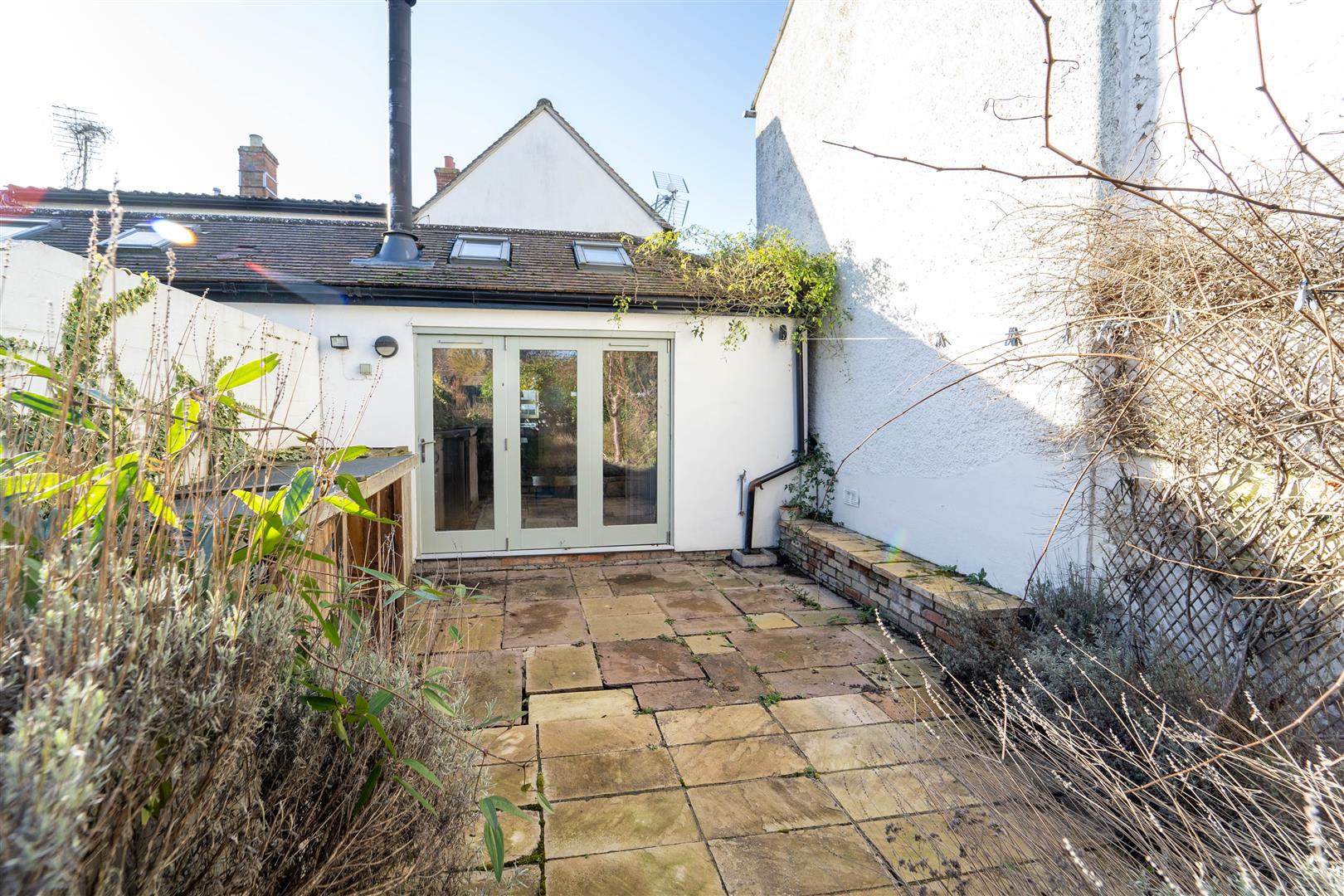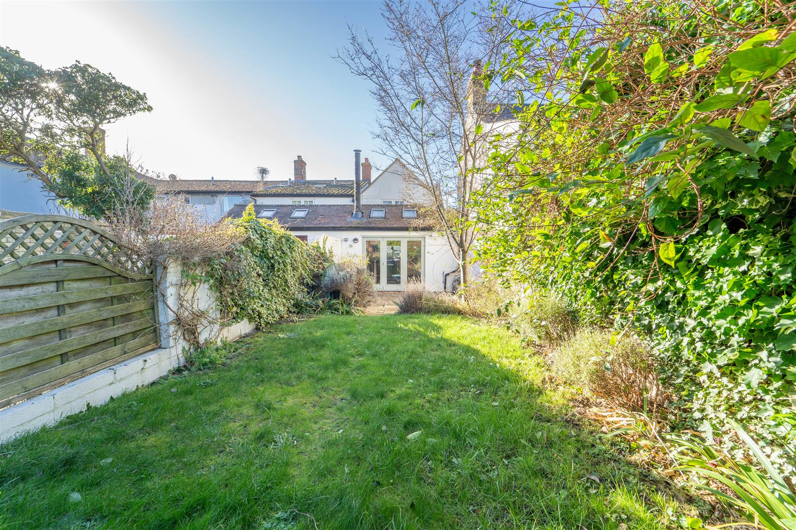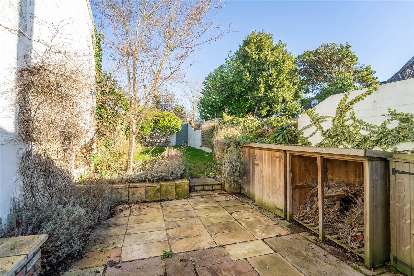Fully enclosed rear garden with paved patio area with timber storage units. Laid to lawn area with a variety of mature trees and shrubs, rear pedestrian gate.