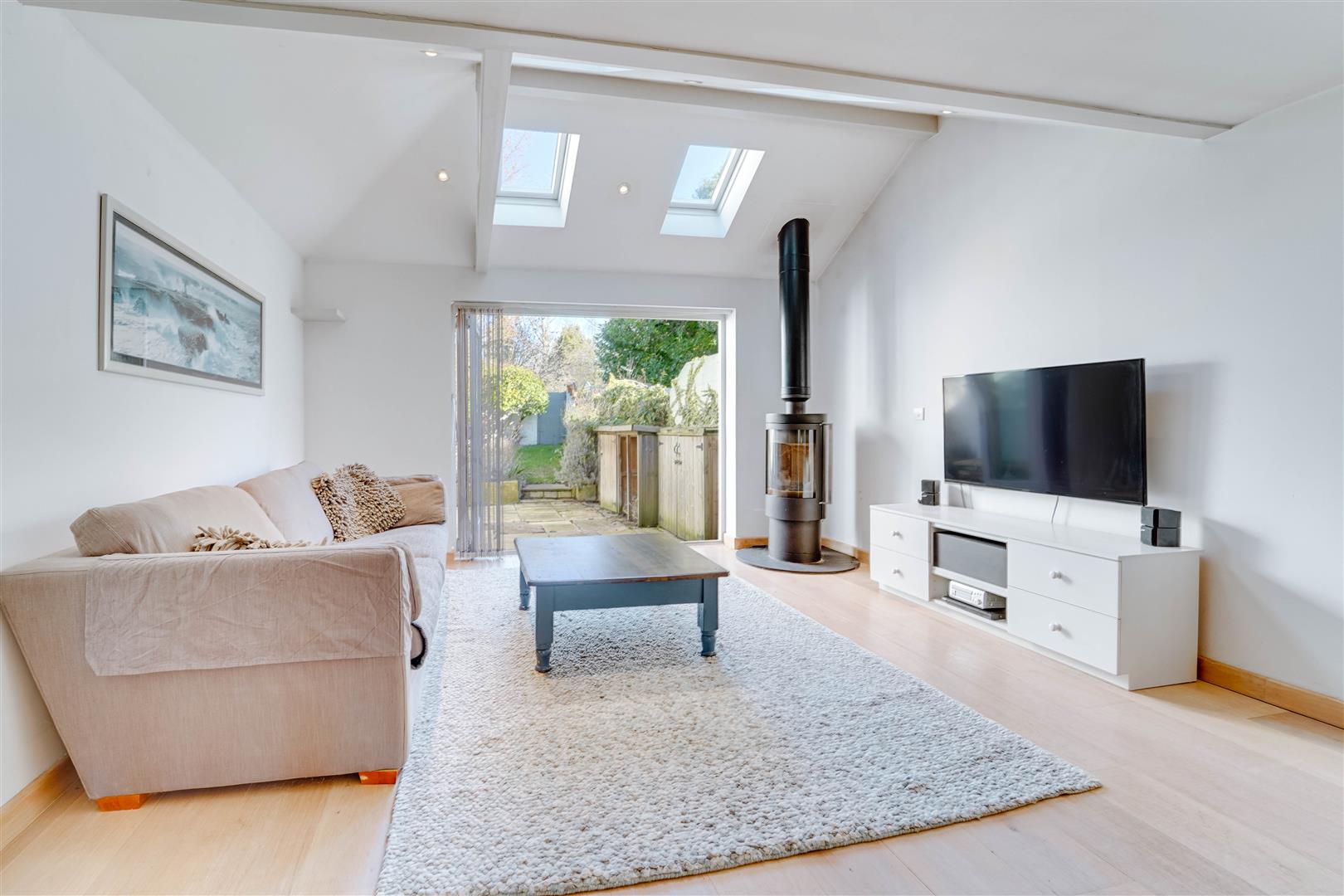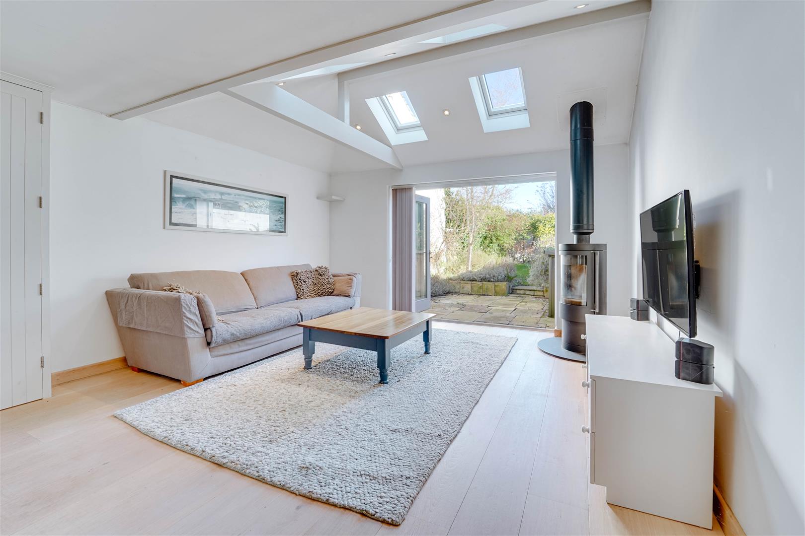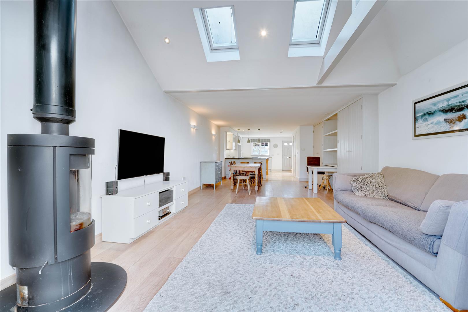 Spacious living room with modern wood burner, laid hard wood flooring, TV connection point, two large bespoke cabinetry cupboards and shelves with retractable desk, two skylights and bi-folding doors out to the rear garden.