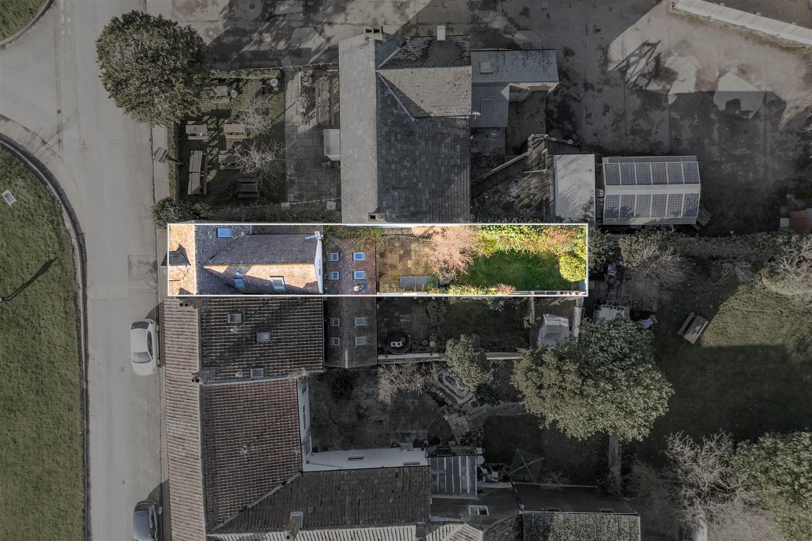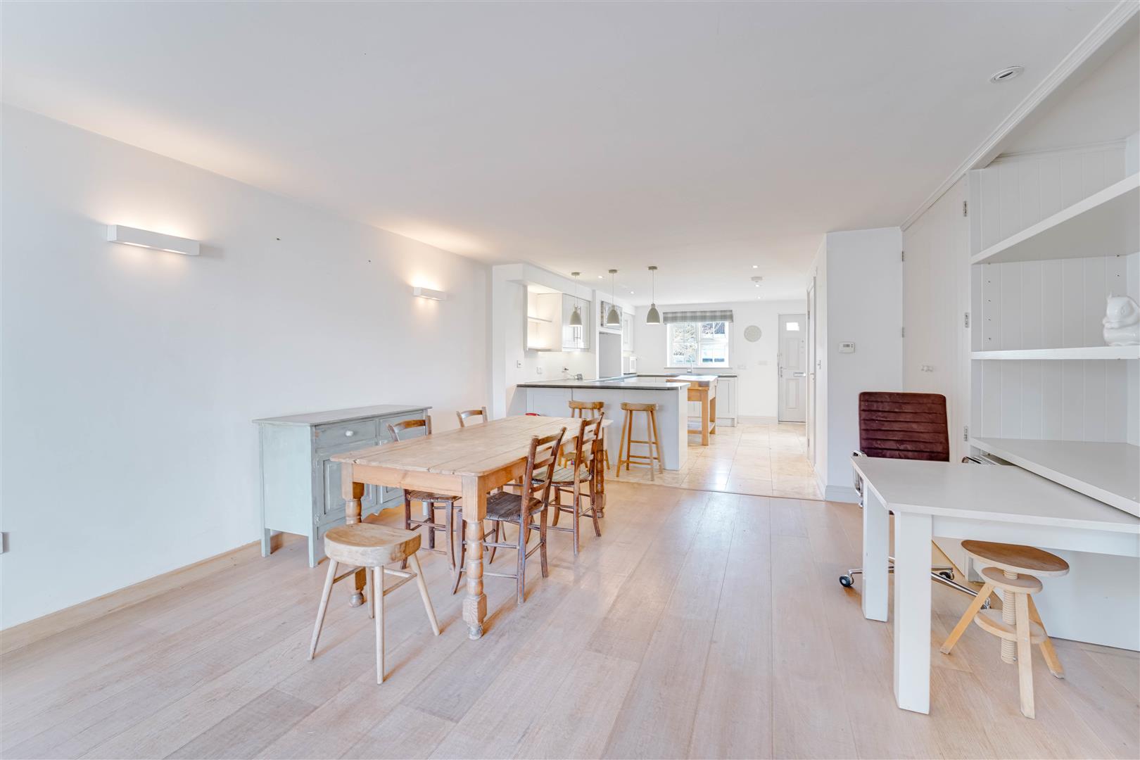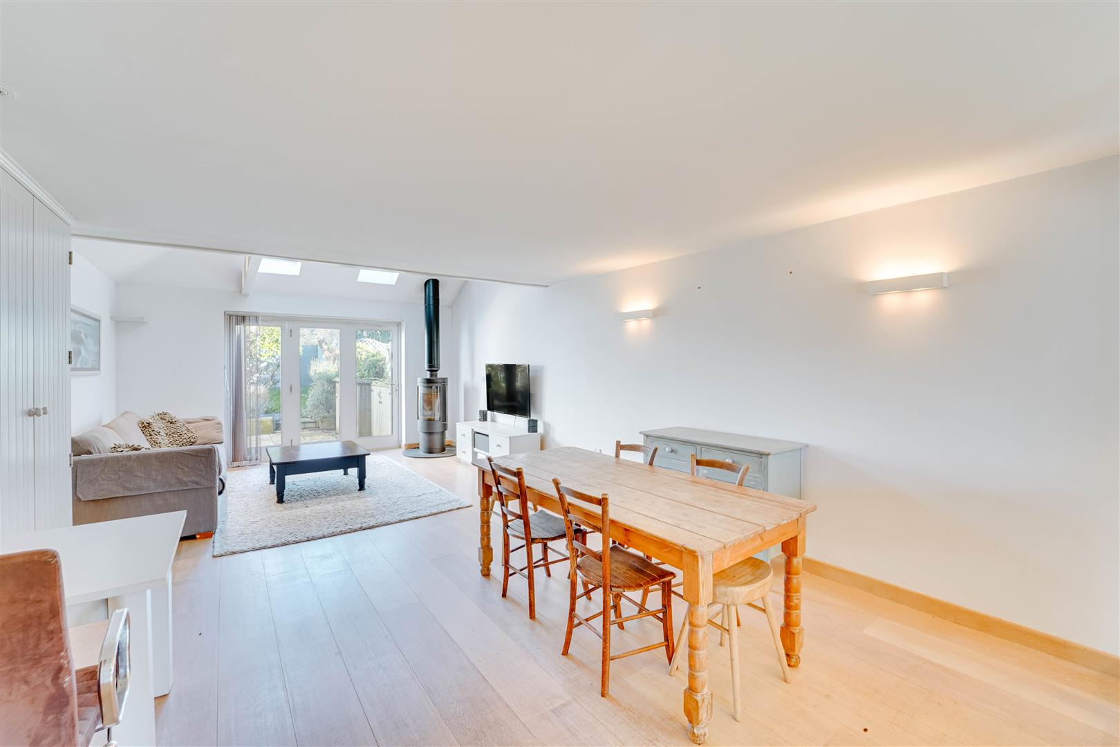 Spacious living room with modern wood burner, laid hard wood flooring, TV connection point, two large bespoke cabinetry cupboards and shelves with retractable desk, two skylights and bi-folding doors out to the rear garden.