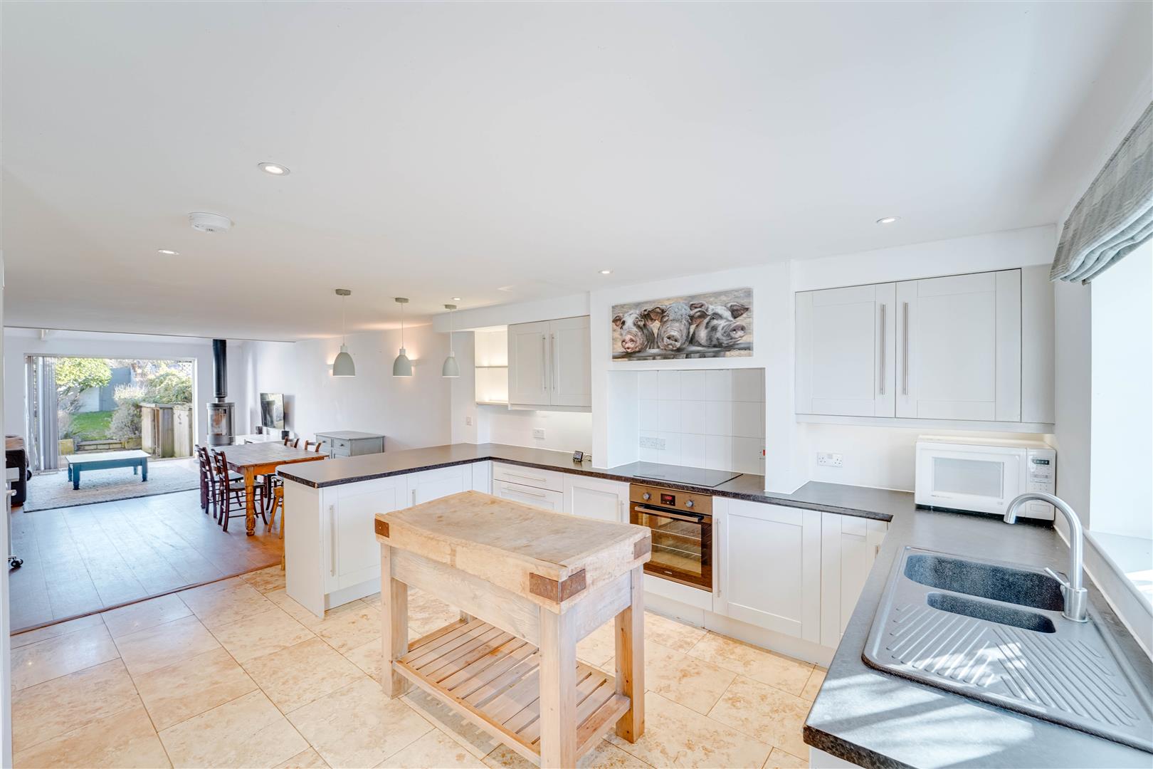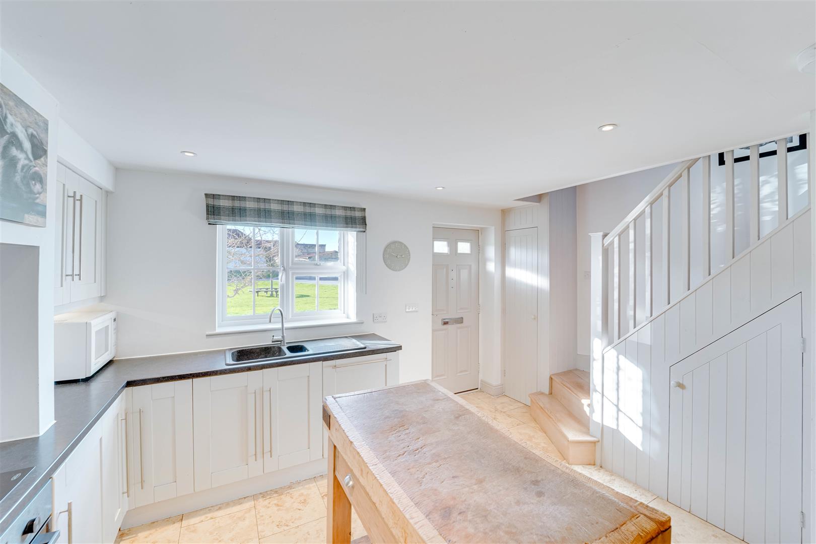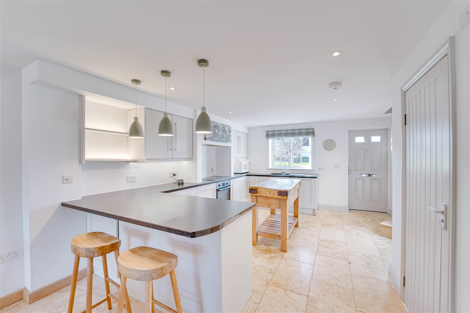 Fitted with a range of matching eye and base level storage units and working tops over, inset sink and drainer with mixer tap and breakfast bar with pendant lighting over. Integrated appliances including oven and four-ring electric hob, dishwasher and fridge/freezer. Staircase rising to the first floor with storage cupboard under, with space and plumbing for a washing machine, and window to the front aspect.