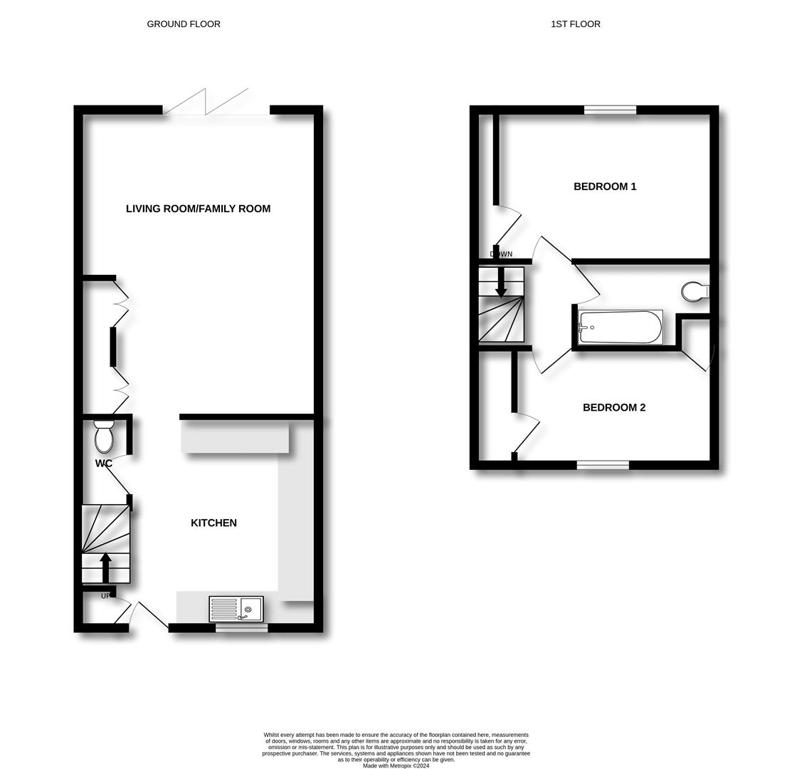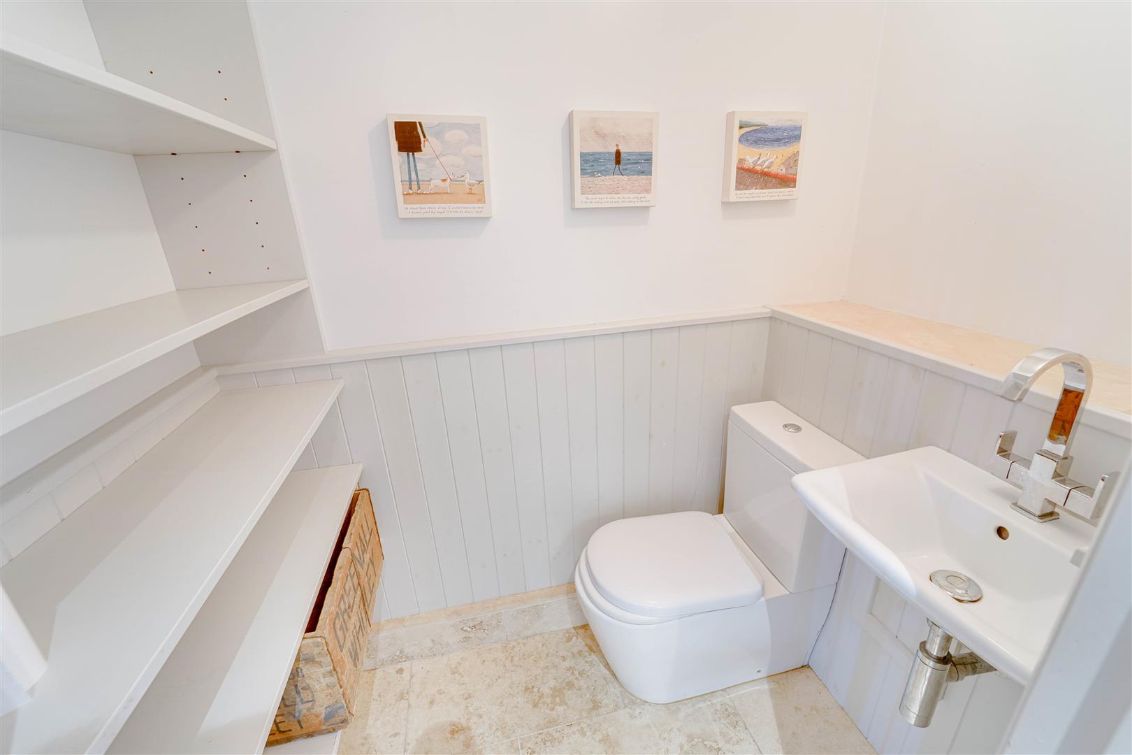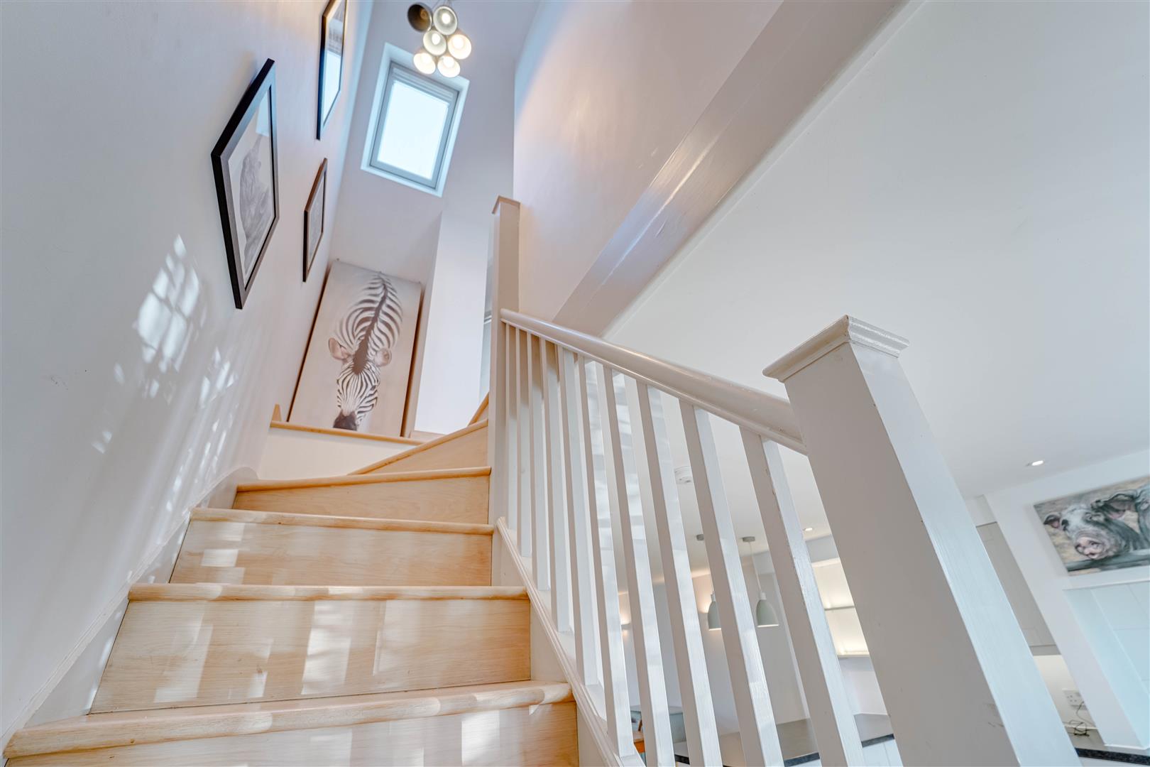Fitted with a range of matching eye and base level storage units and working tops over, inset sink and drainer with mixer tap and breakfast bar with pendant lighting over. Integrated appliances including oven and four-ring electric hob, dishwasher and fridge/freezer. Staircase rising to the first floor with storage cupboard under, with space and plumbing for a washing machine, and window to the front aspect.