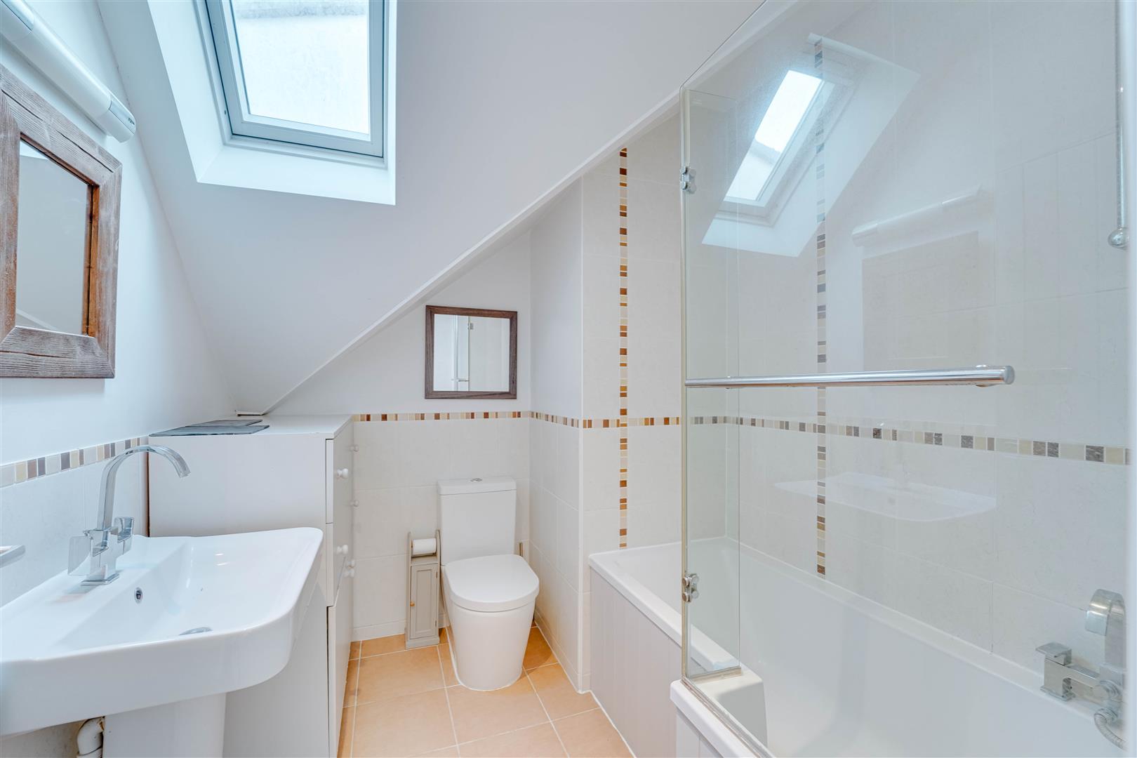 Three piece suite comprising of a low level WC, pedestal wash basin, P-shaped bath with wall mounted shower, part tiled walls and skylight.