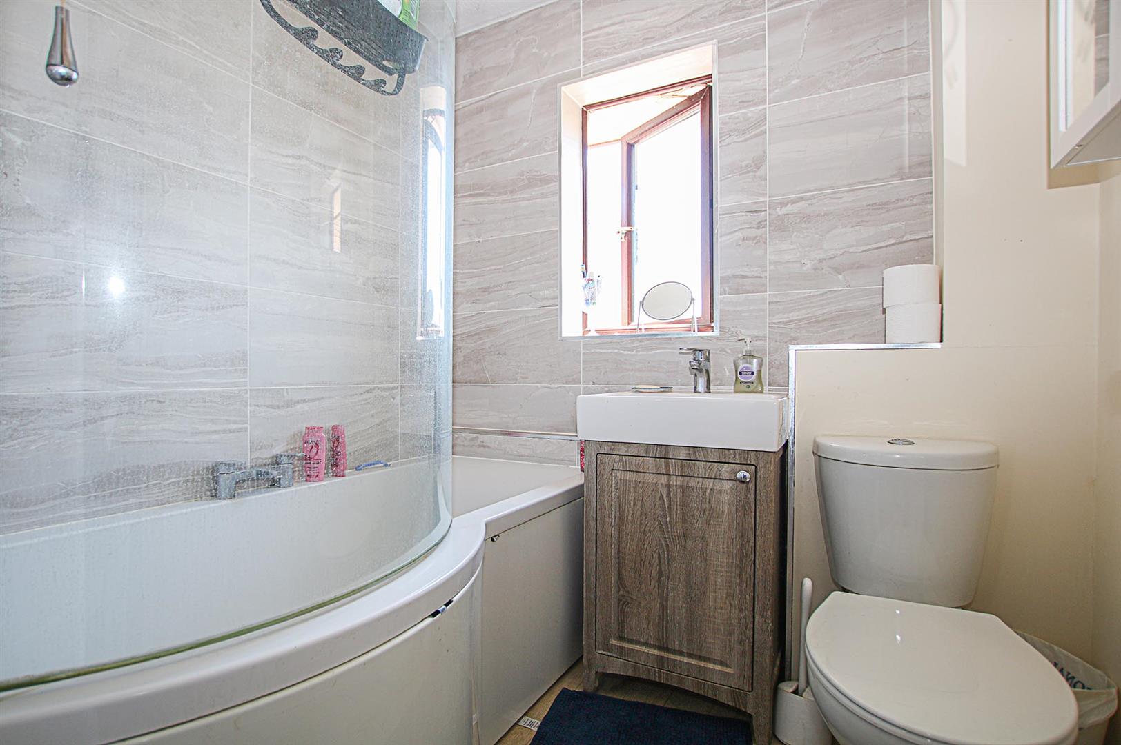 Three piece bathroom suite comprising a low level WC, hand basin with vanity cupboard under, p-shaped panelled bath with wall mounted shower head, radiator and obscured window to the rear aspect.