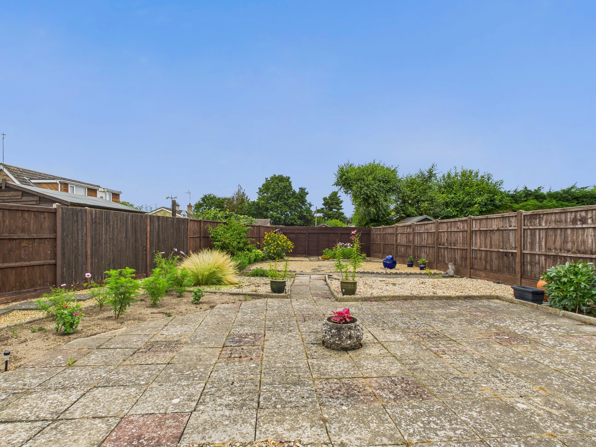 The property enjoys a generous frontage which comprises largely of a gravel driveway which provides a high level of parking for vehicles large and small. To the side of the bungalow is the garage which has metal up and over door. There is also a small area of garden to the front and access gate leading around to the side. The rear garden is fully enclosed by fencing and comprises largely of lower maintenance areas that include patios, pathways, and gravel areas. Throughout the garden, there are beds housing a variety of shrubbery. Around to the other side, there is a potting shed/store which then leads directly through to the garage.