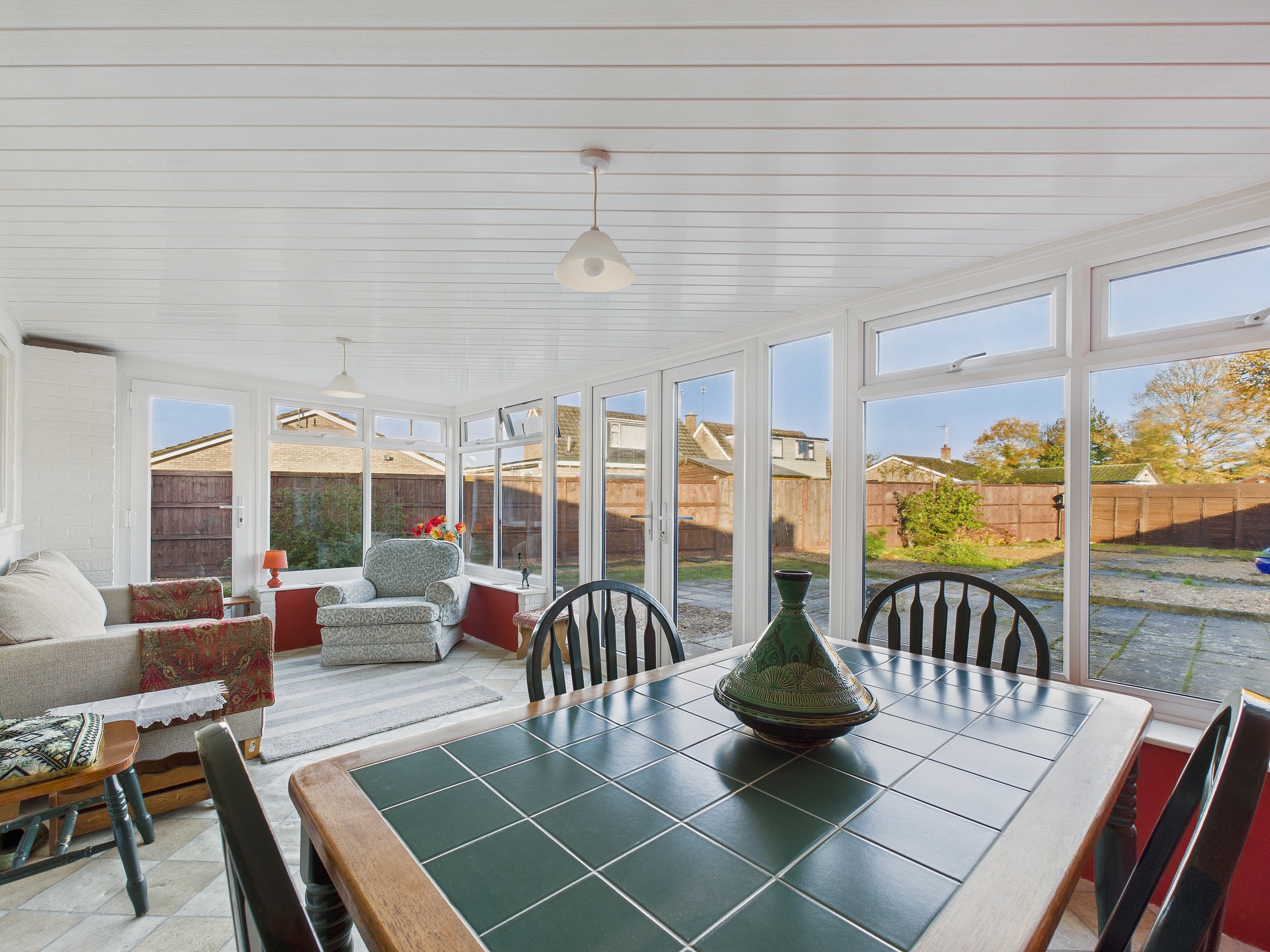 uPVC double glazed windows overlooking the garden, brick base, polycarbonate internal roofing, uPVC double glazed door to side, further uPVC double glazed double opening doors to rear.