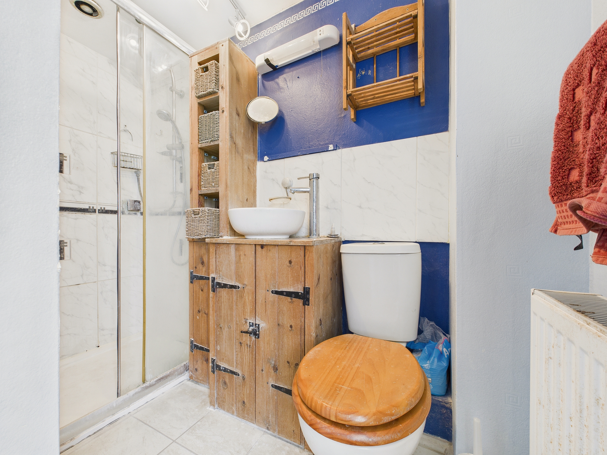 uPVC double glazed window to front, wall mounted double panel radiator, double shower cubicle, w.c., handwash basin inset to vanity unit, extractor.