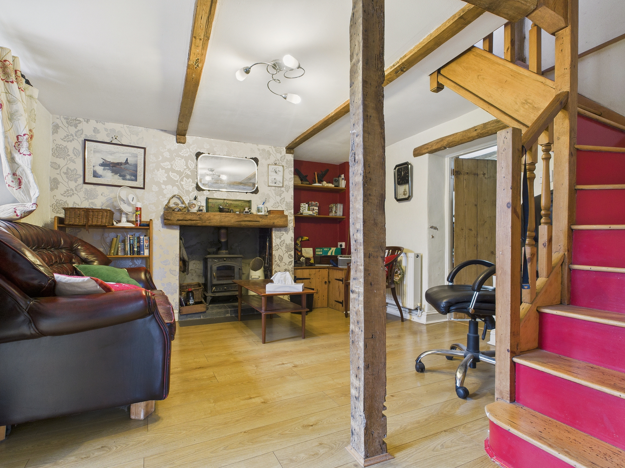 2 x uPVC double glazed windows to front with window seat, 2 x wall mounted double panel radiators, stairs to first floor with storage cupboard under, central fireplace with cast iron stove inset with bressummer beam over, laminate style flooring, ceiling beams, door to:-