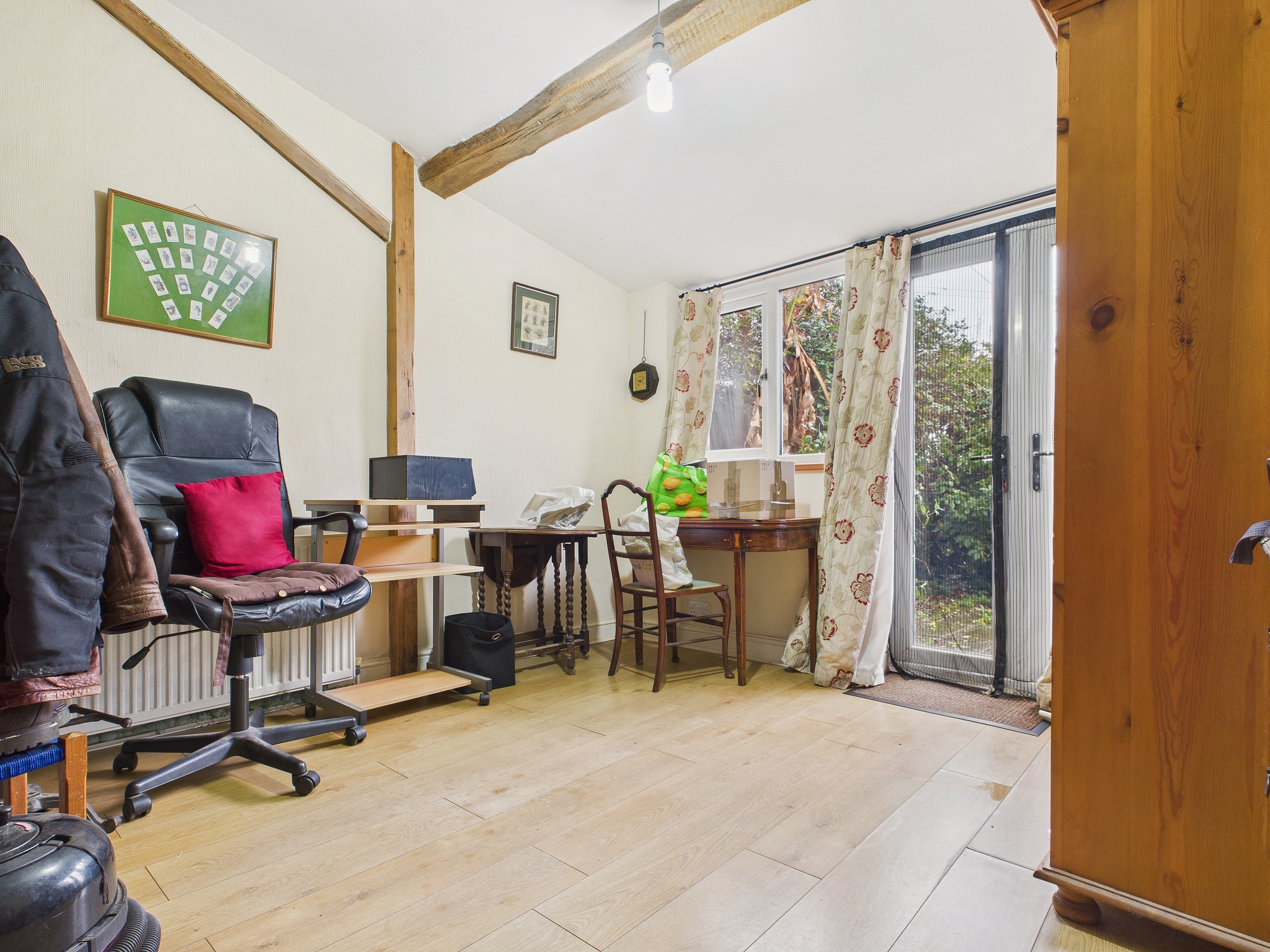 uPVC double glazed window and French doors to rear, wall mounted double panel radiator, laminate style flooring, high level storage cupboards, exposed beams to ceiling, door to:-