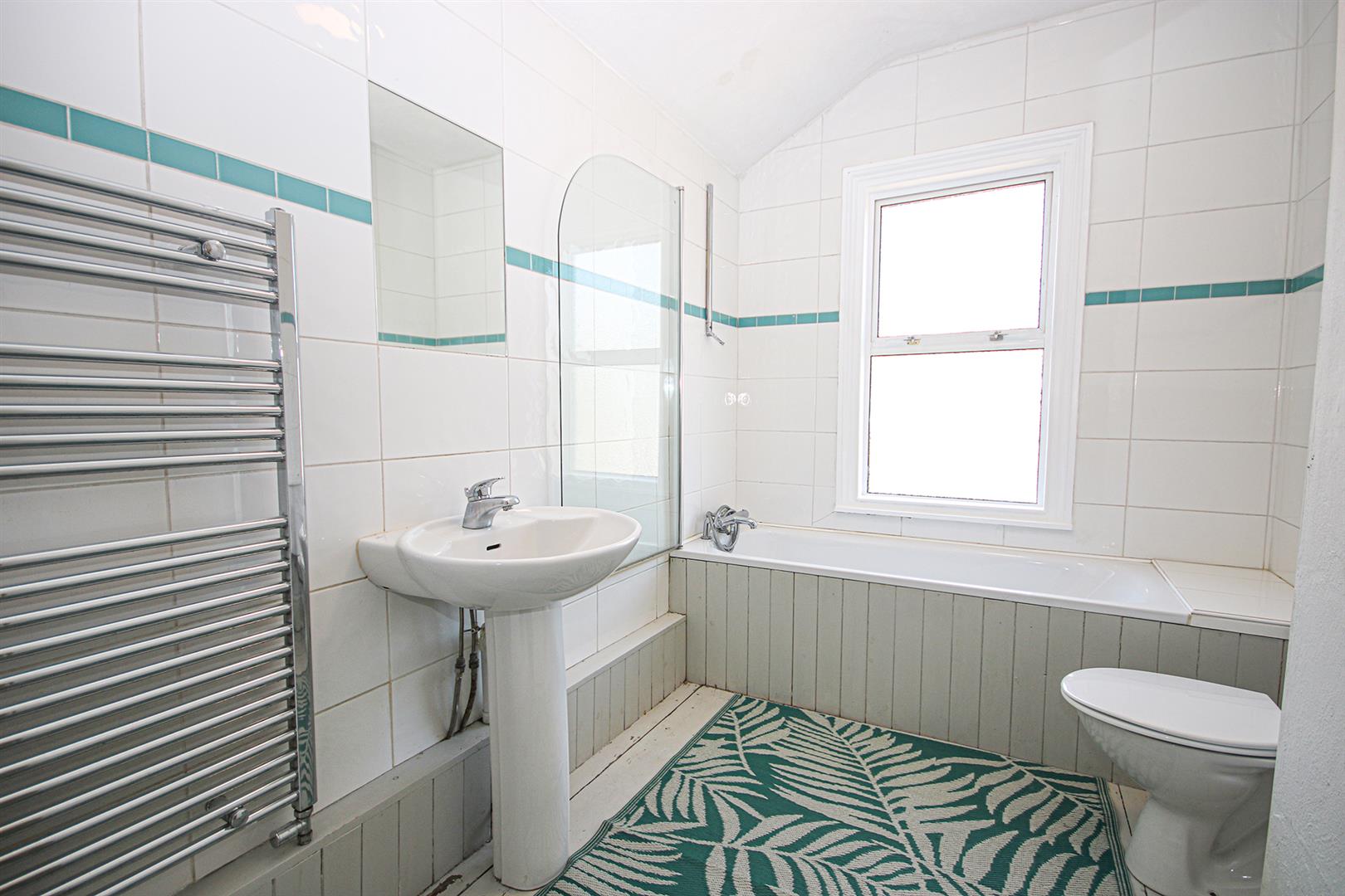Modern white suite comprising W.C., pedestal hand basin with mixer tap over and panelled bath with mixer tap and shower attachment over. Attractively tiled walls. Wooden flooring. Ladder radiator. Obscured window. Door to landing.