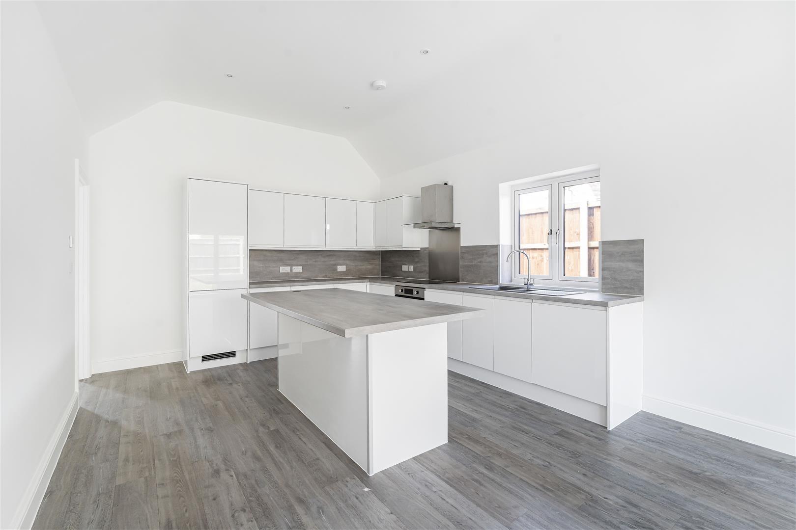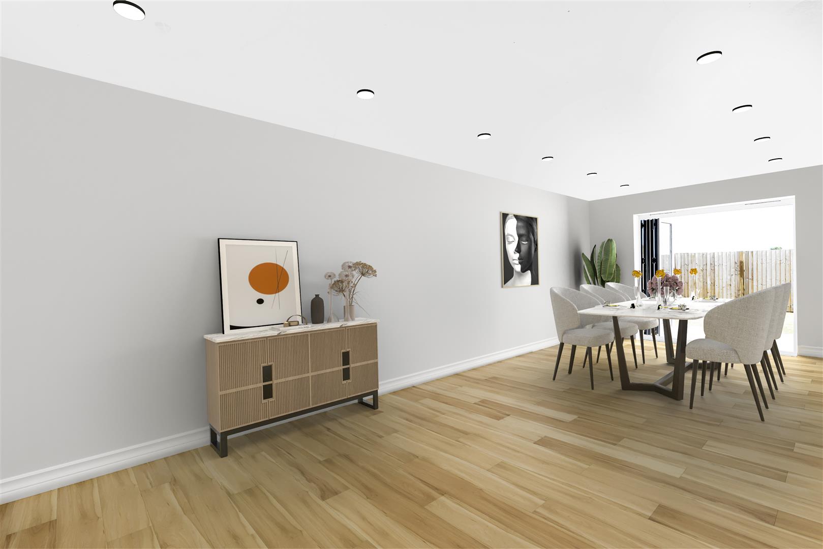 Contemporary range of matching eye and base level cupboards with composite worktop over. Composite sink and drainer with mixer tap over. Lamona integrated oven with induction hob and stainless steel splashback and extractor over. integrated dishwasher, washing machine and fridge/freezer. LVT wood flooring. Underfloor heating. Bi-folding doors to garden. Dual aspect windows. Opening to rear hall. Door to entrance hall.