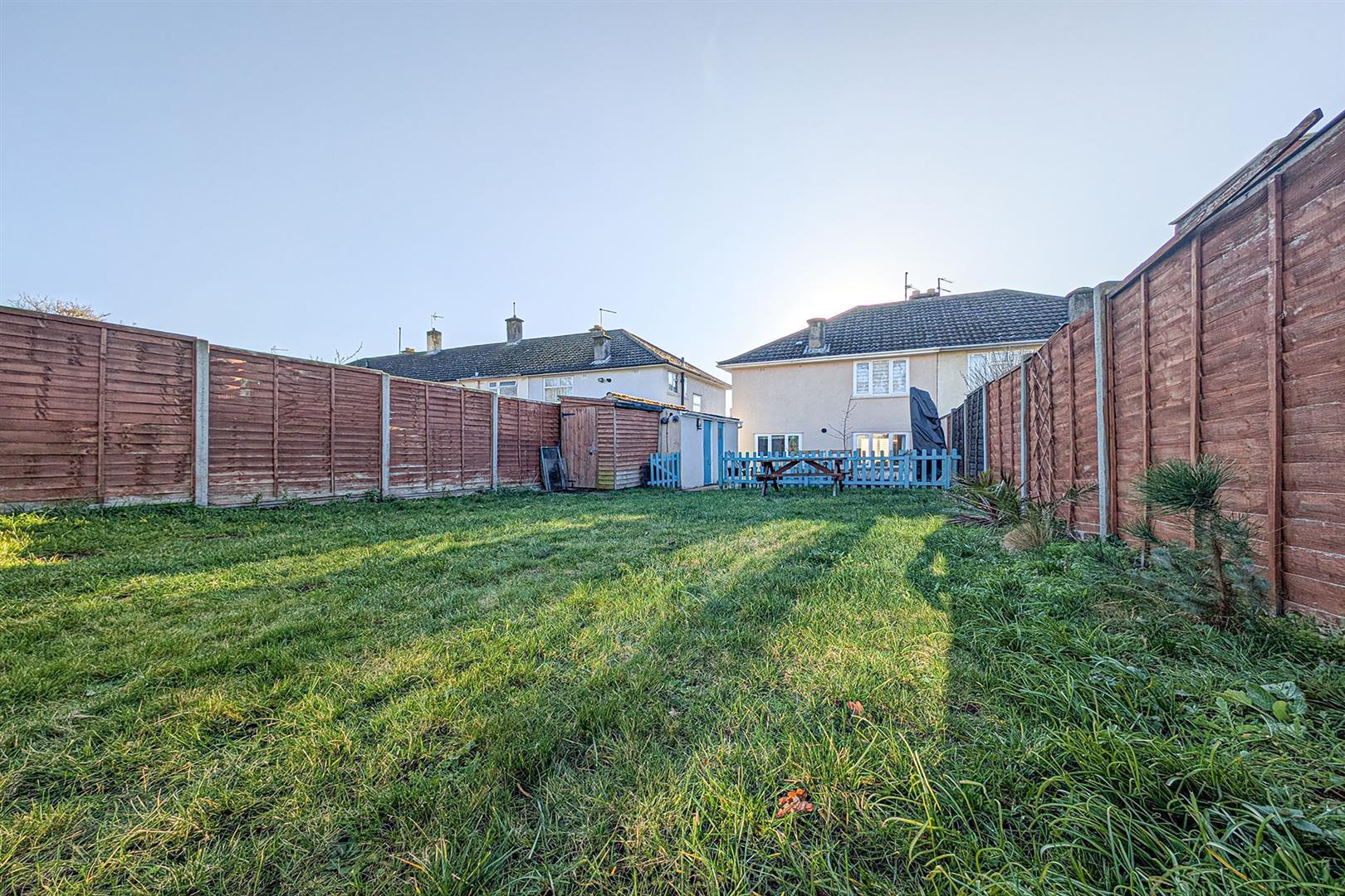 Patio area to the rear of the house with door to the kitchen. Sizable lawned area with stepping stone pathway leading to the garden room/studio/office to the rear, with covered open storage to the side. Access gate to the front.