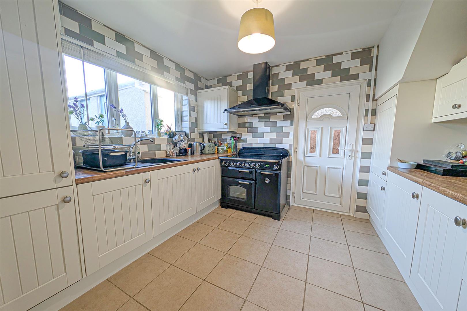 A range of eye and base level cupboards and storage drawers with wooden worktop over. Composite sink and drainer with mixer tap over. Space and connection for electric cooker with chimney extractor above. Integrated fridge/freezer. Attractively tiled. Tiled flooring. Window to the rear aspect. Door to the dining room and rear garden.