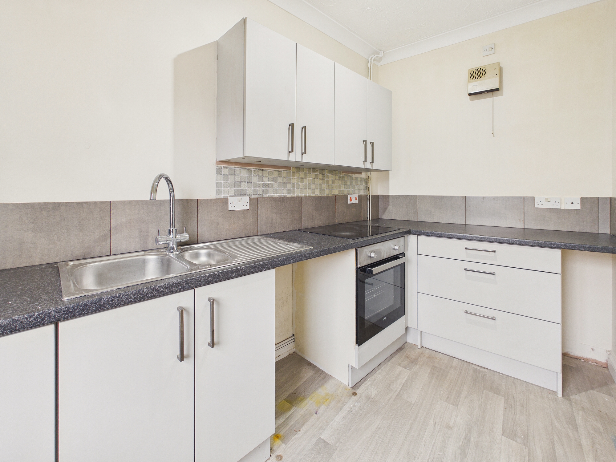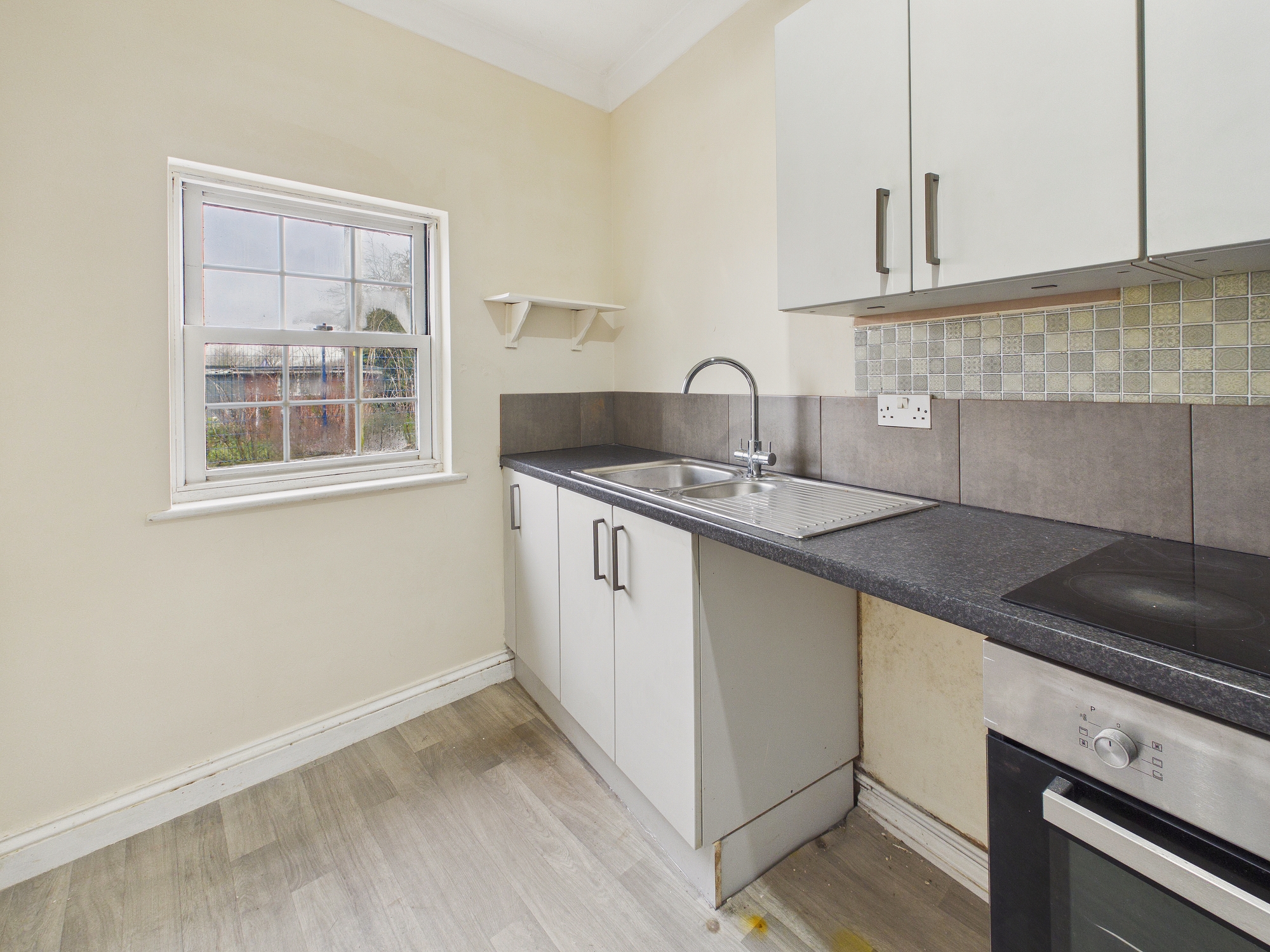 Modern wall and base units with worktop over, stainless steel 1 1/2 bowl sink drainer inset, electric oven and hob, space for washing machine, wall mounted electric fan heater, window to front.