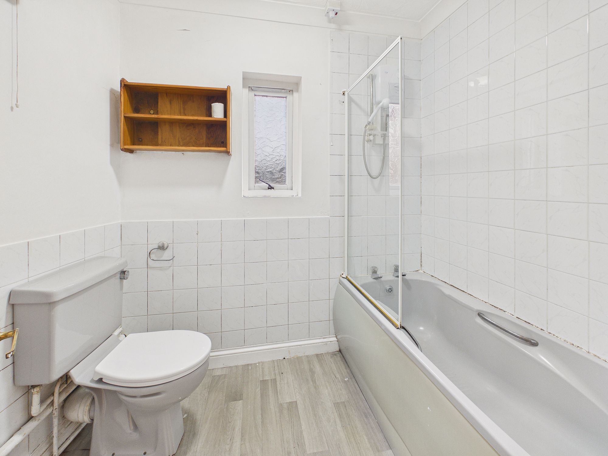 Bath with electric shower over, low level w.c., handwash basin, electric wall mounted fan heaters, window to rear.