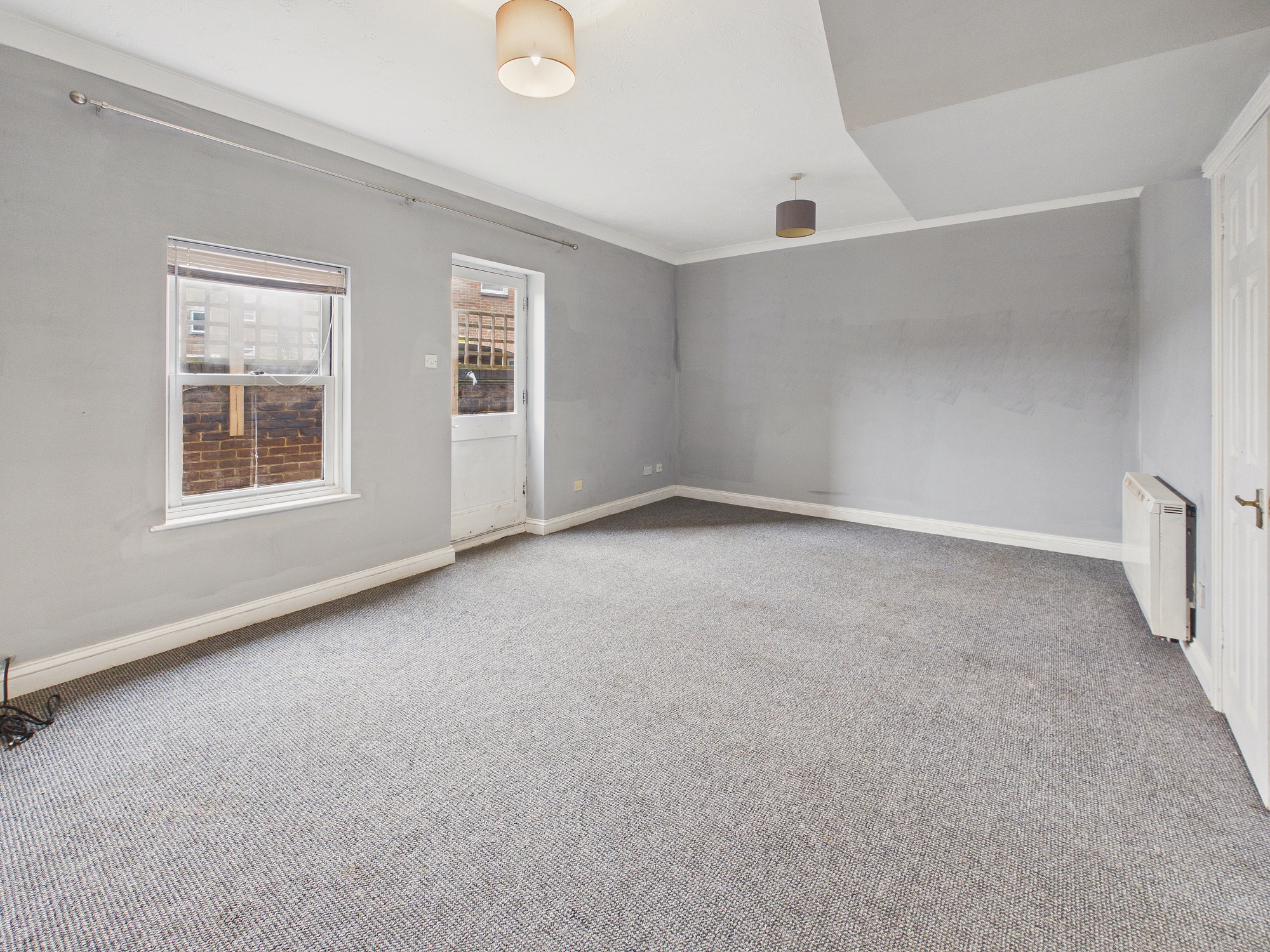 2 x electric heaters, door and window to rear, understairs storage cupboard.