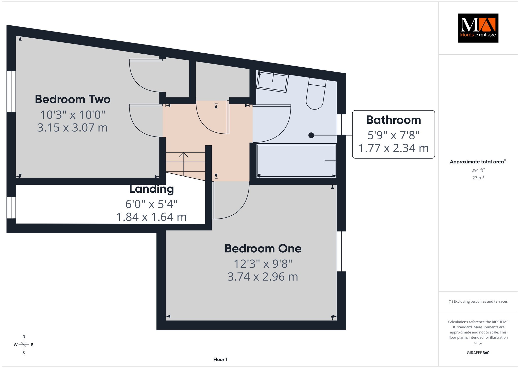Bedroom One 12’3” x 9’8” (3.74m x 2.96m)