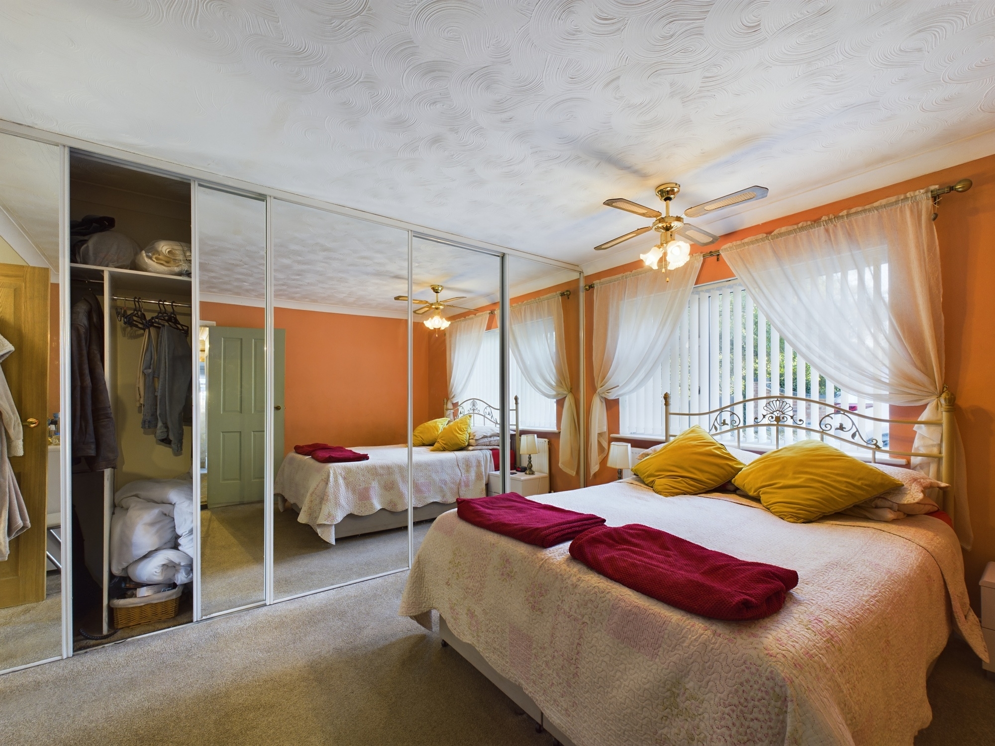 uPVC double glazed window to front, wall mounted single panel radiator, a range of built in wardrobes with mirrored sliding doors, textured and coved ceiling, ceiling fan, door to:-