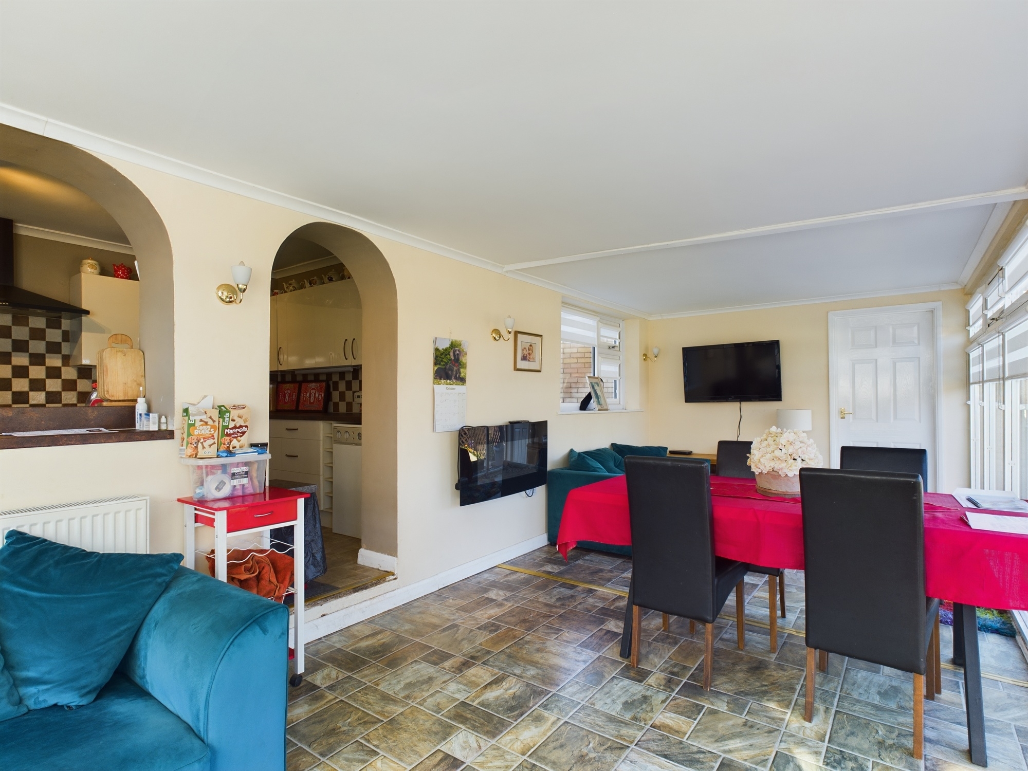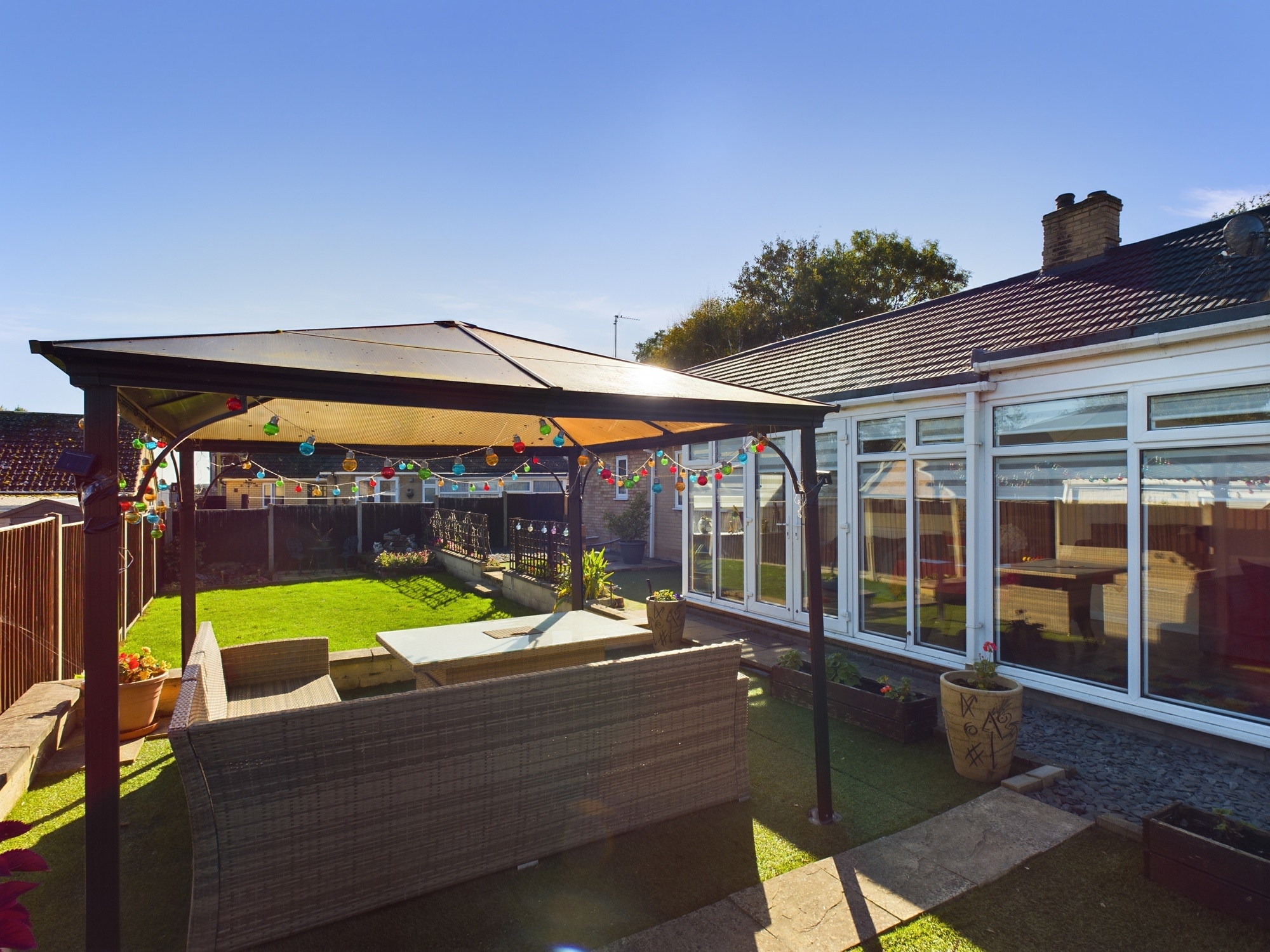 The front of the property is laid to shingle providing off road parking for several vehicles and leads to the converted garage. All enclosed by brick wall with pathway leading to the rear garden. There is also access to the front entrance porch and side hallway. There is a area laid to astro turf enclosed by picket fencing. The rear garden has various areas over different levels, laid to patio, astro turf and also lawned areas with some flowers inset. There is also a covered area and a further area laid to shingle with growing beds and a wooden storage shed.
