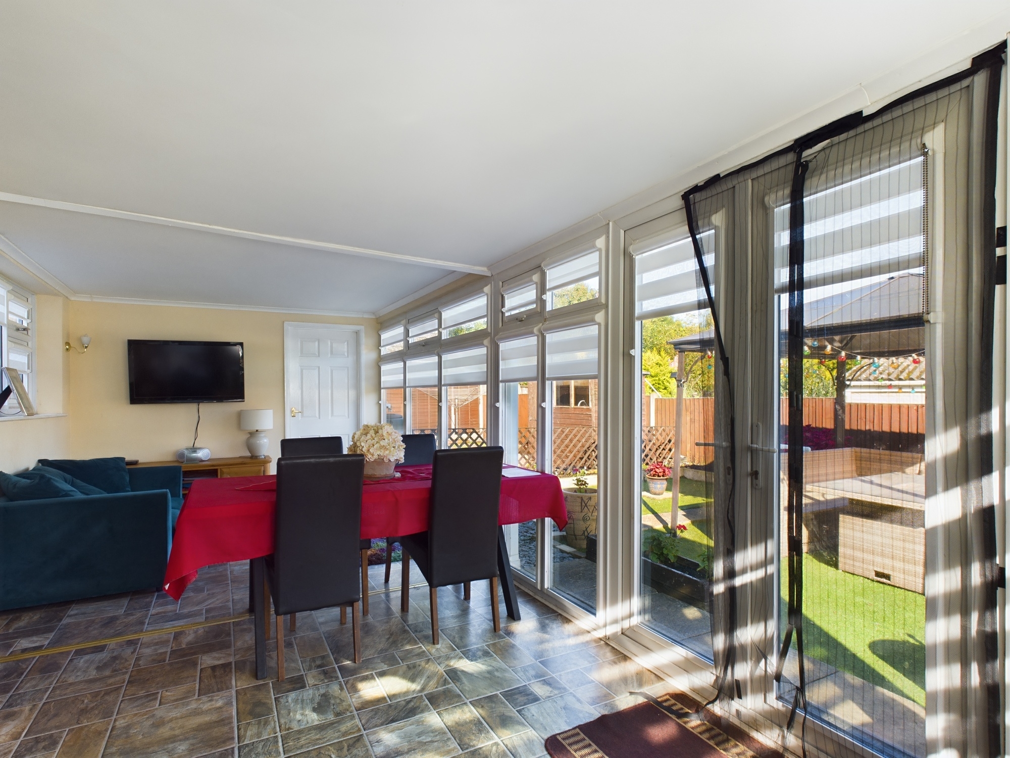 uPVC double glazed floor to ceiling construction, uPVC double glazed window to front, uPVC double glazed doors to rear garden, lino style flooring, wall mounted electric fire, wall mounted double panel radiator, wall mounted TV, door to:-