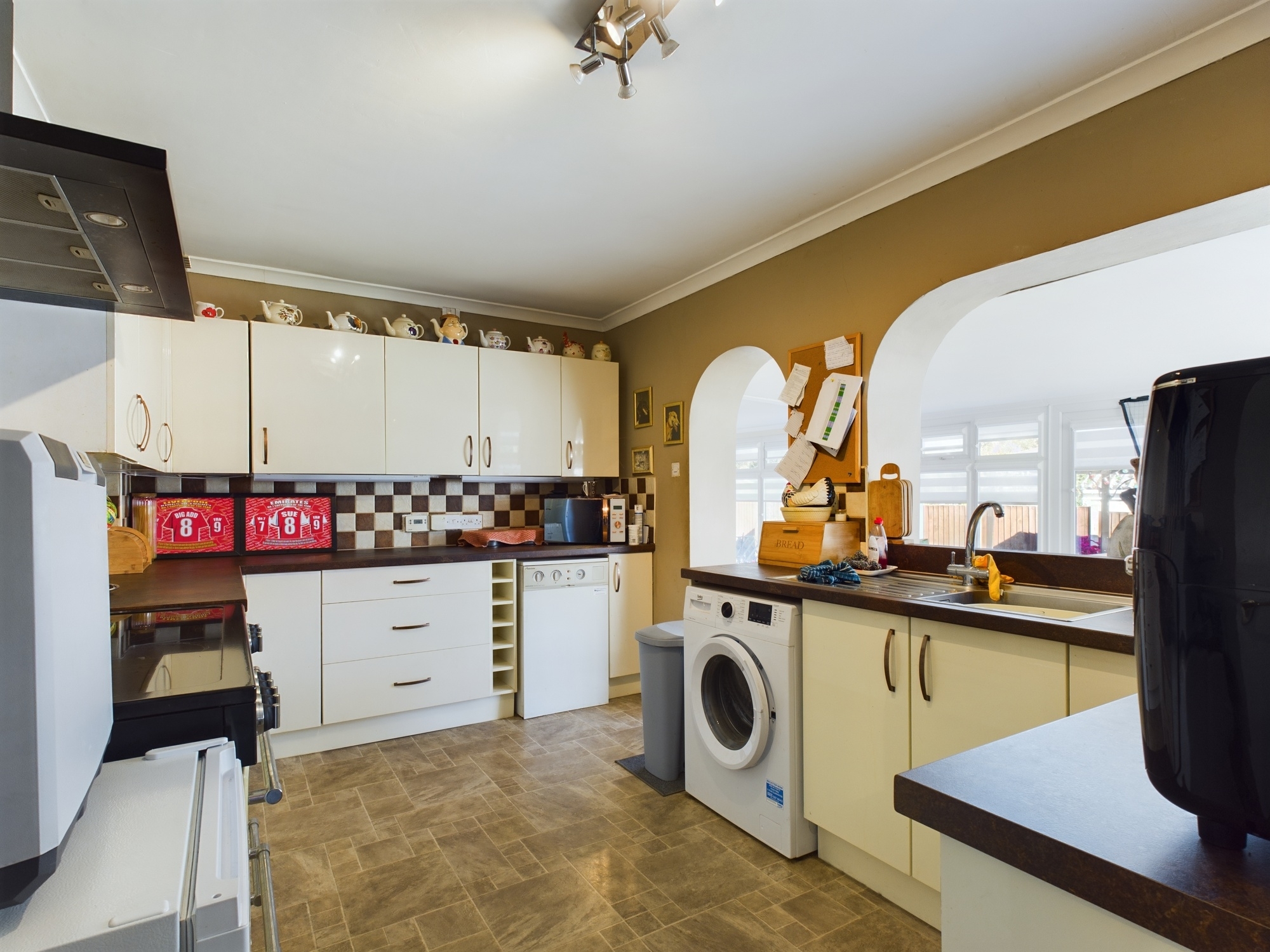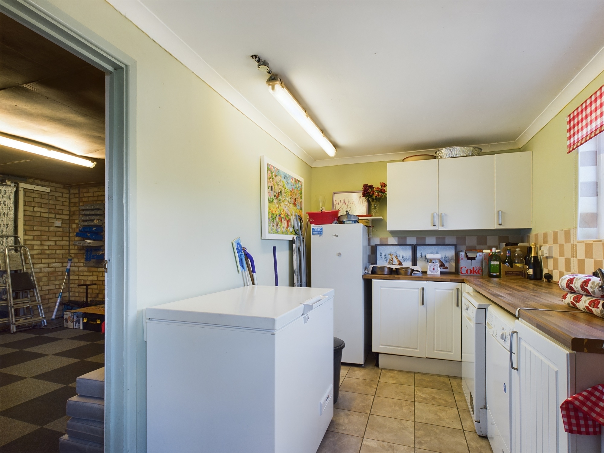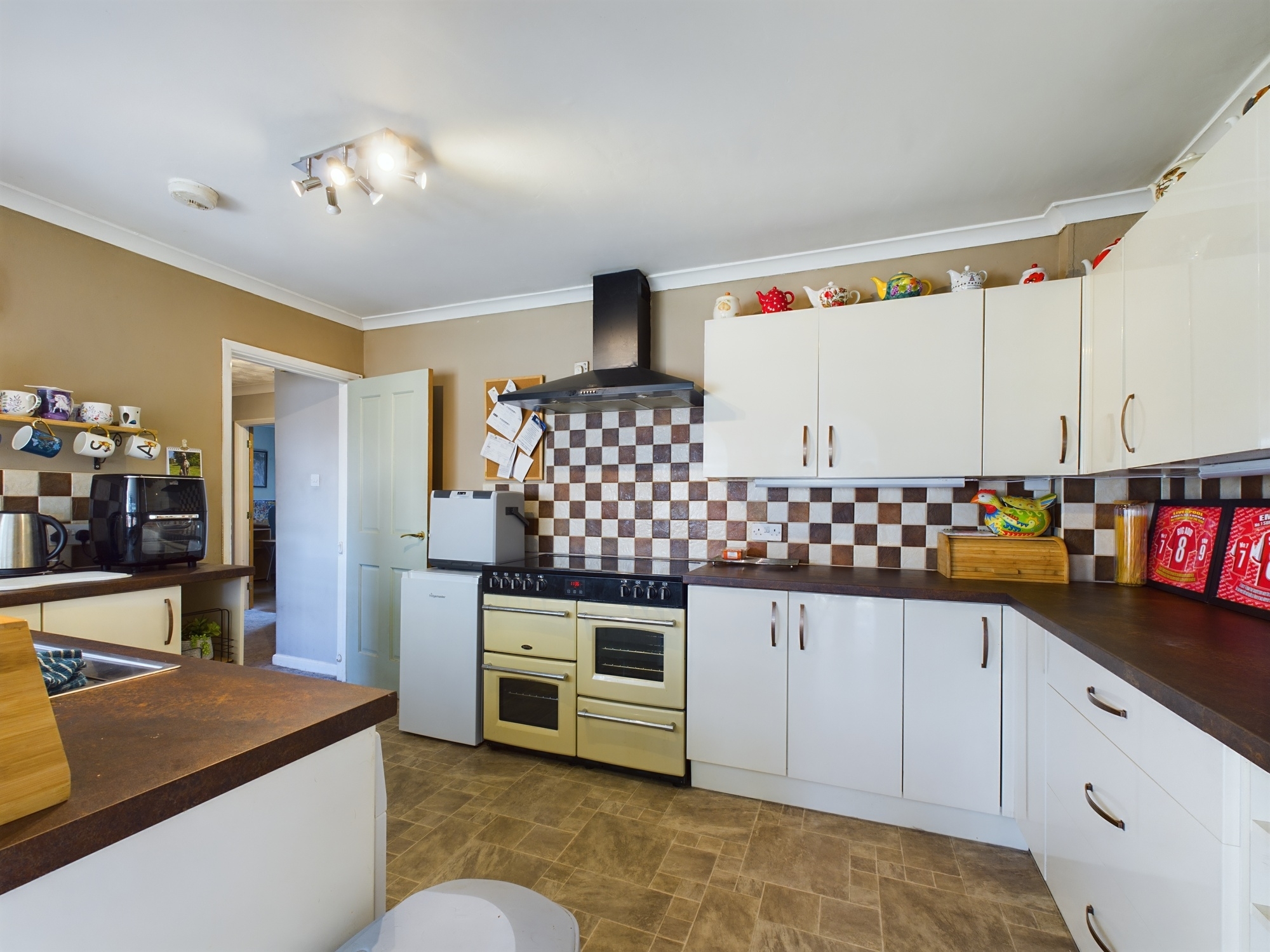 Opening through to the garden room, wall and base units under round edge worksurfaces, stainless steel sink drainer inset with mixer tap over, Belling electric range oven and hob with extractor over, space for washing machine, free standing oil central heating boiler, lino style flooring, coved ceiling, under counter lighting.