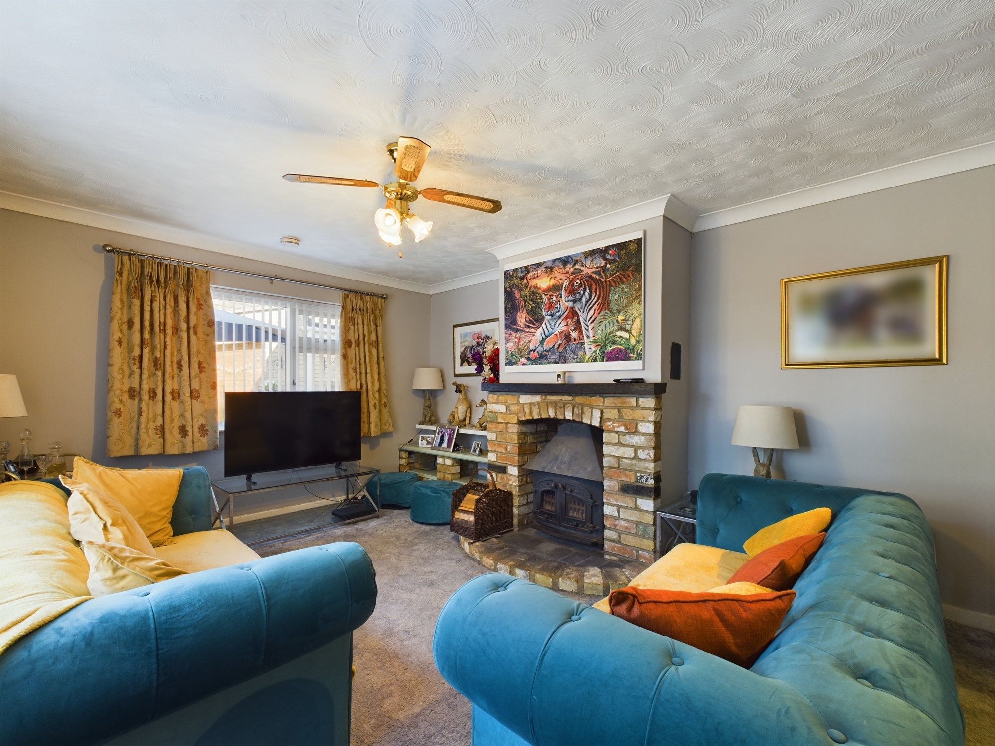 uPVC double glazed window to front and side, wall mounted double panel radiator, brick central fireplace with wood burning stove inset, textured and coved ceiling, central ceiling fan.