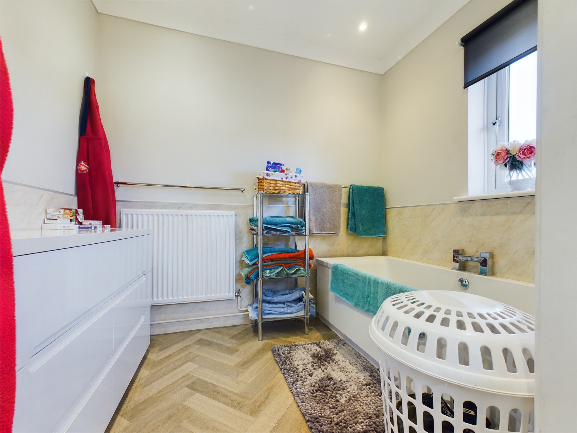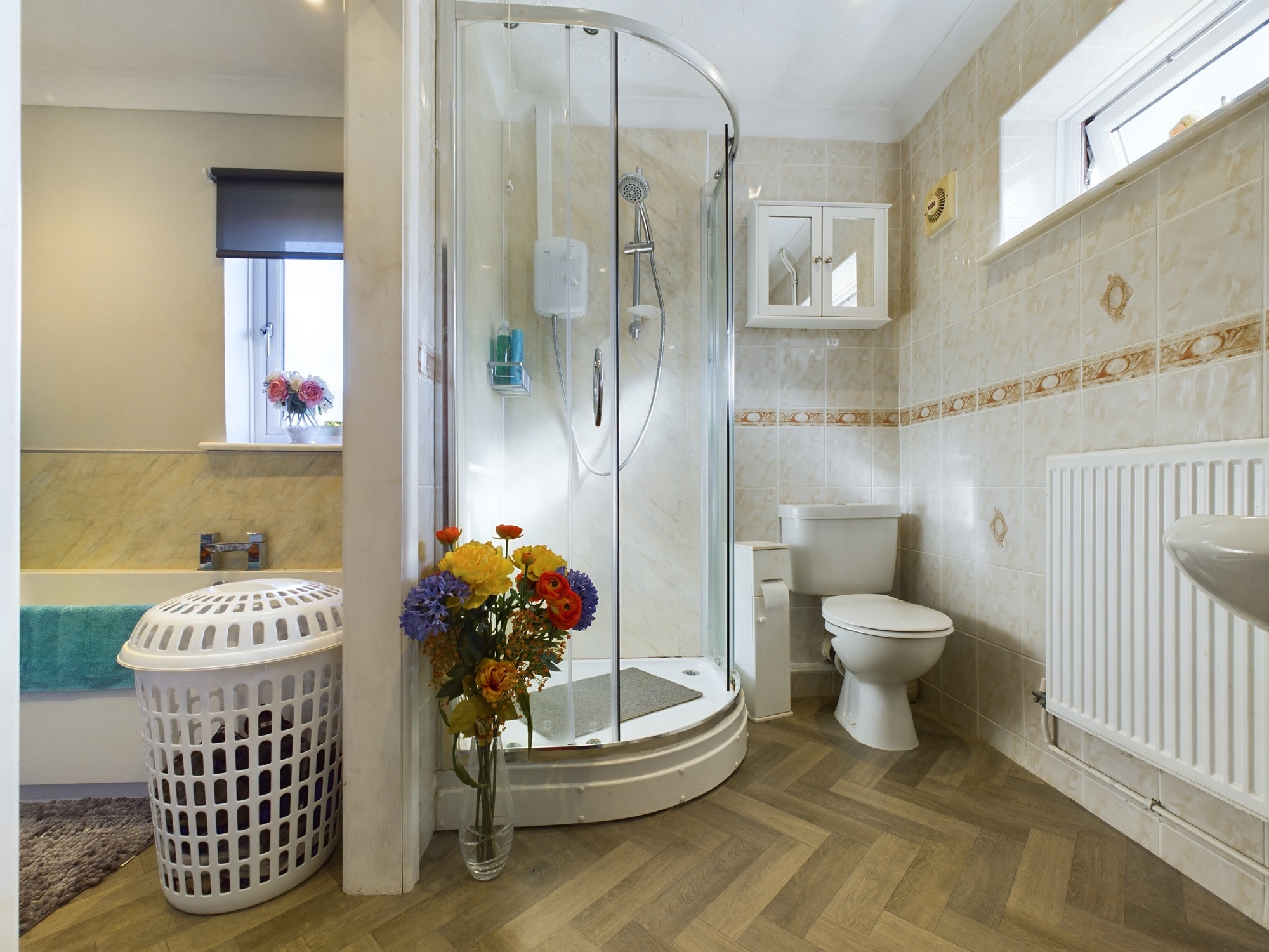 uPVC double glazed window to side, wall mounted single panel radiator, corner shower cubicle, w.c., pedestal handwash basin, textured and coved ceiling, extractor, lino style flooring, opening through to further area with panelled bath, uPVC double glazed window to rear, wall mounted single panel radiator, textured and coved ceiling, loft access, lino style flooring.