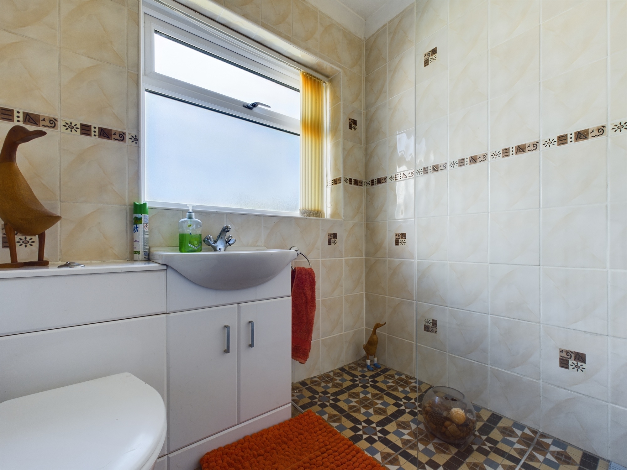 uPVC double glazed window to rear, wall mounted double panel radiator, walk in shower with glass shower screen, fully tiled walls and flooring, concealed cistern w.c. and handwash basin inset to vanity unit, textured and coved ceiling, extractor.
