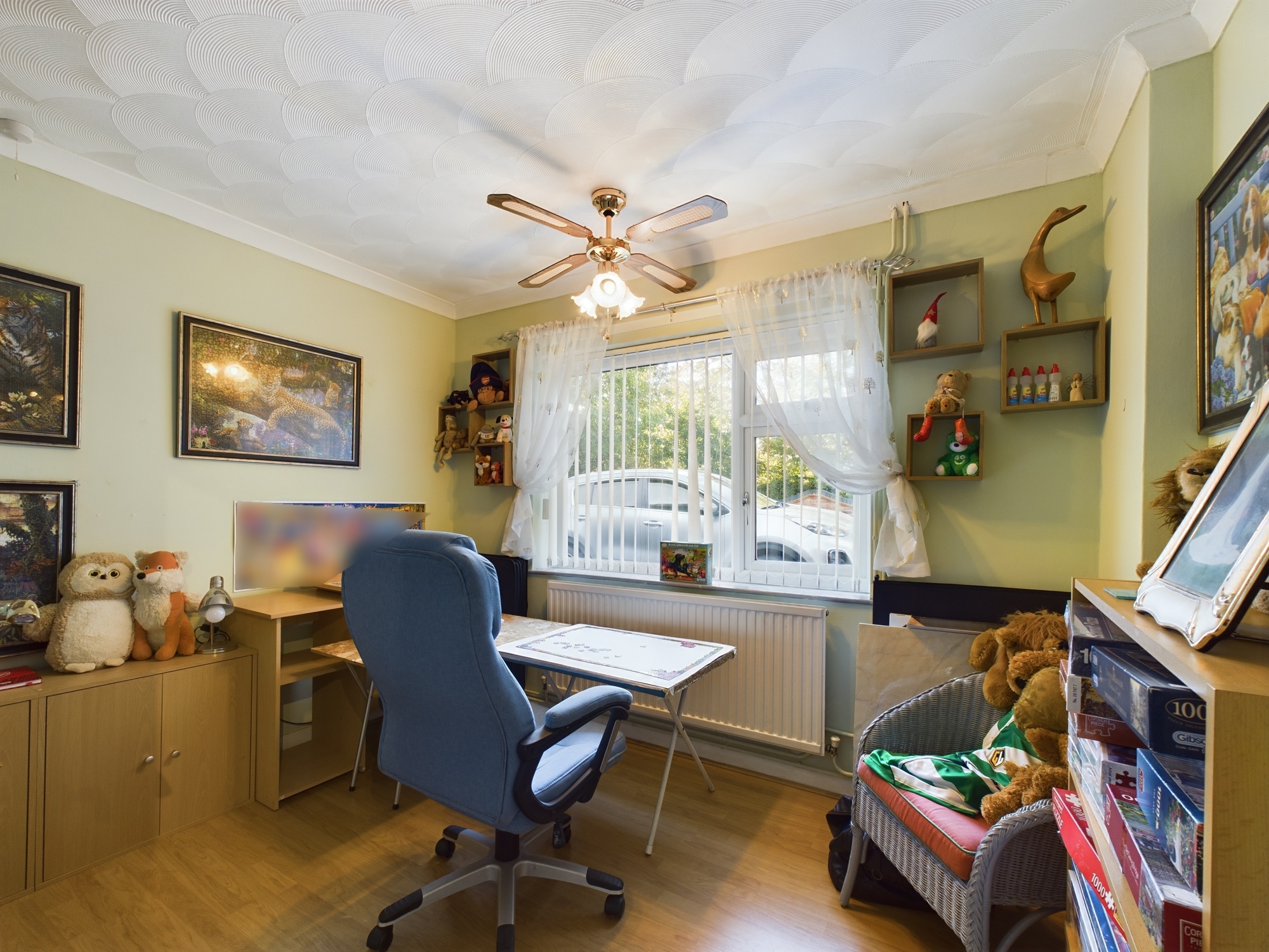 uPVC double glazed window to front, wall mounted single panel radiator, textured and coved with ceiling fan, laminate style flooring.