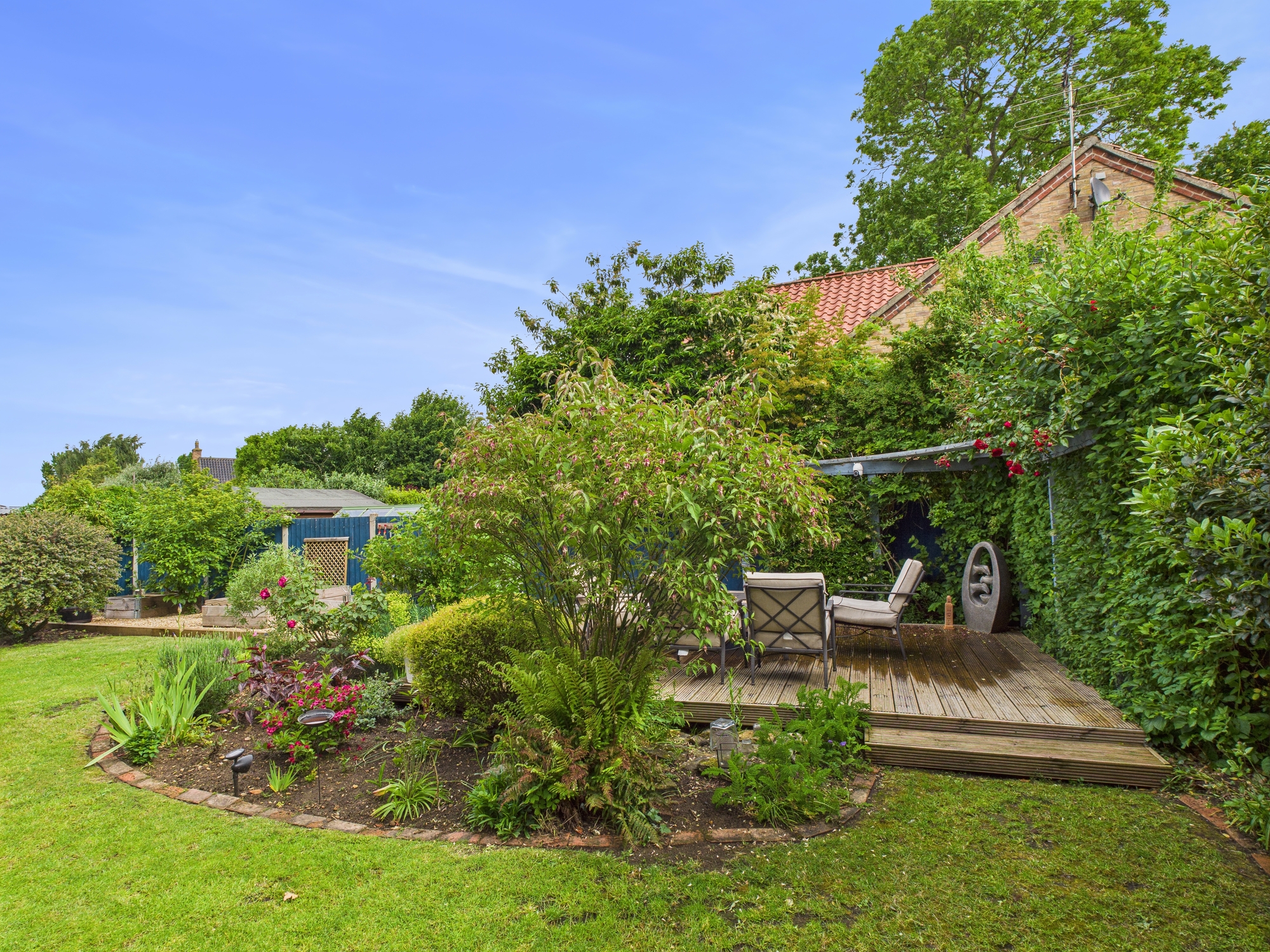To the front of the property there is a brick weave driveway shared with the neighbouring property which leads to the private driveway providing off road parking and leads to the carport and garage. To the rear of the carport there is a log and bin store and a personal door leads into the garage. A path continues to the side around to the rear garden which is mainly laid to lawn with a patio and decked area inset with a range of matures bushes, flowers and shrubs inset and to borders.