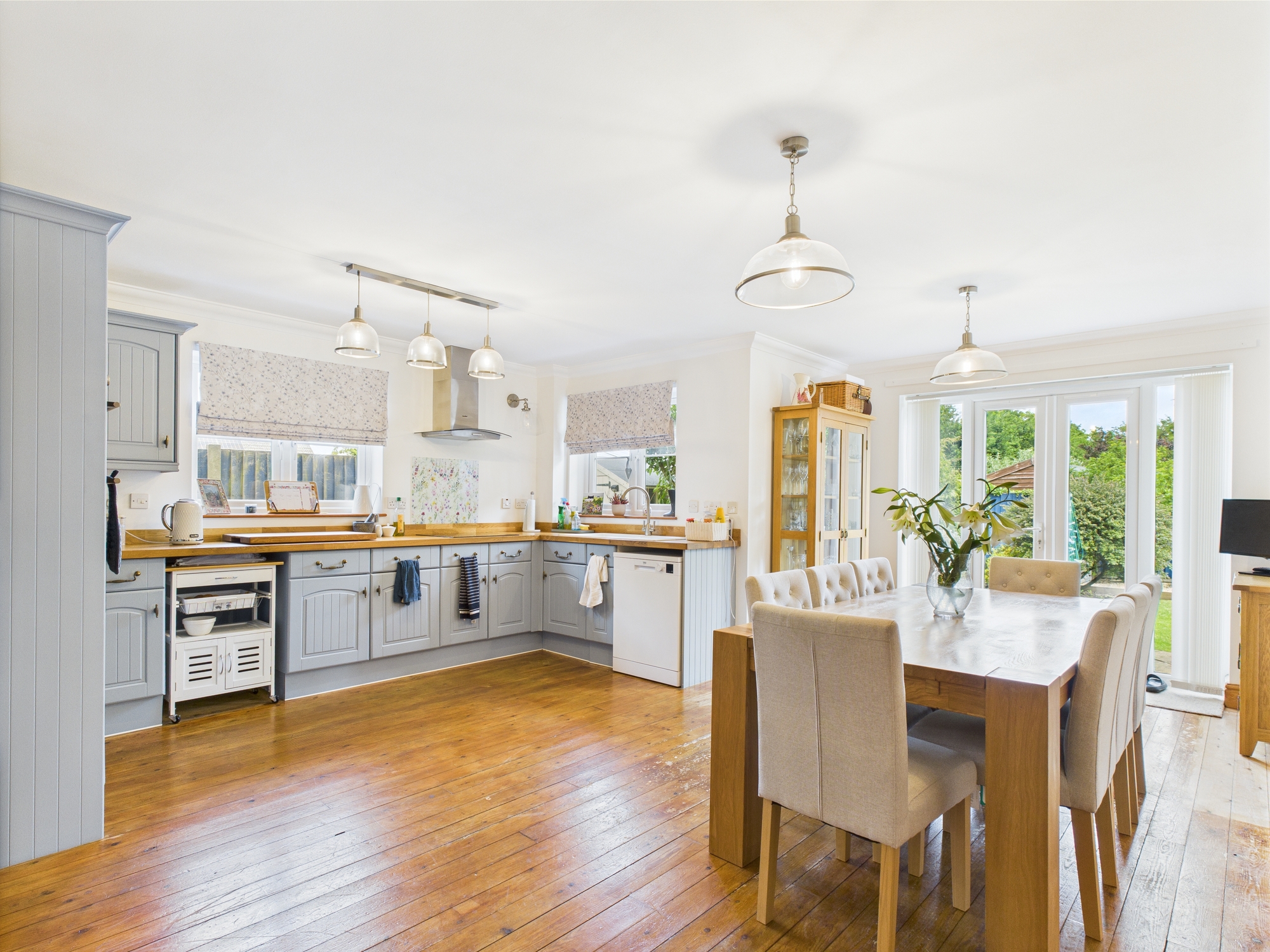 Wall mounted double panel radiator, uPVC double glazed window to side and rear, uPVC double glazed patio doors to rear, wooden flooring, wall and base units under square edge wooden block worksurfaces, sink drainer inset with mixer tap over, 4 ring hob inset to worksurface with stainless steel extractor over, eye level double oven, space for dishwasher and further under counter appliance, coved ceiling, part glazed door to:-