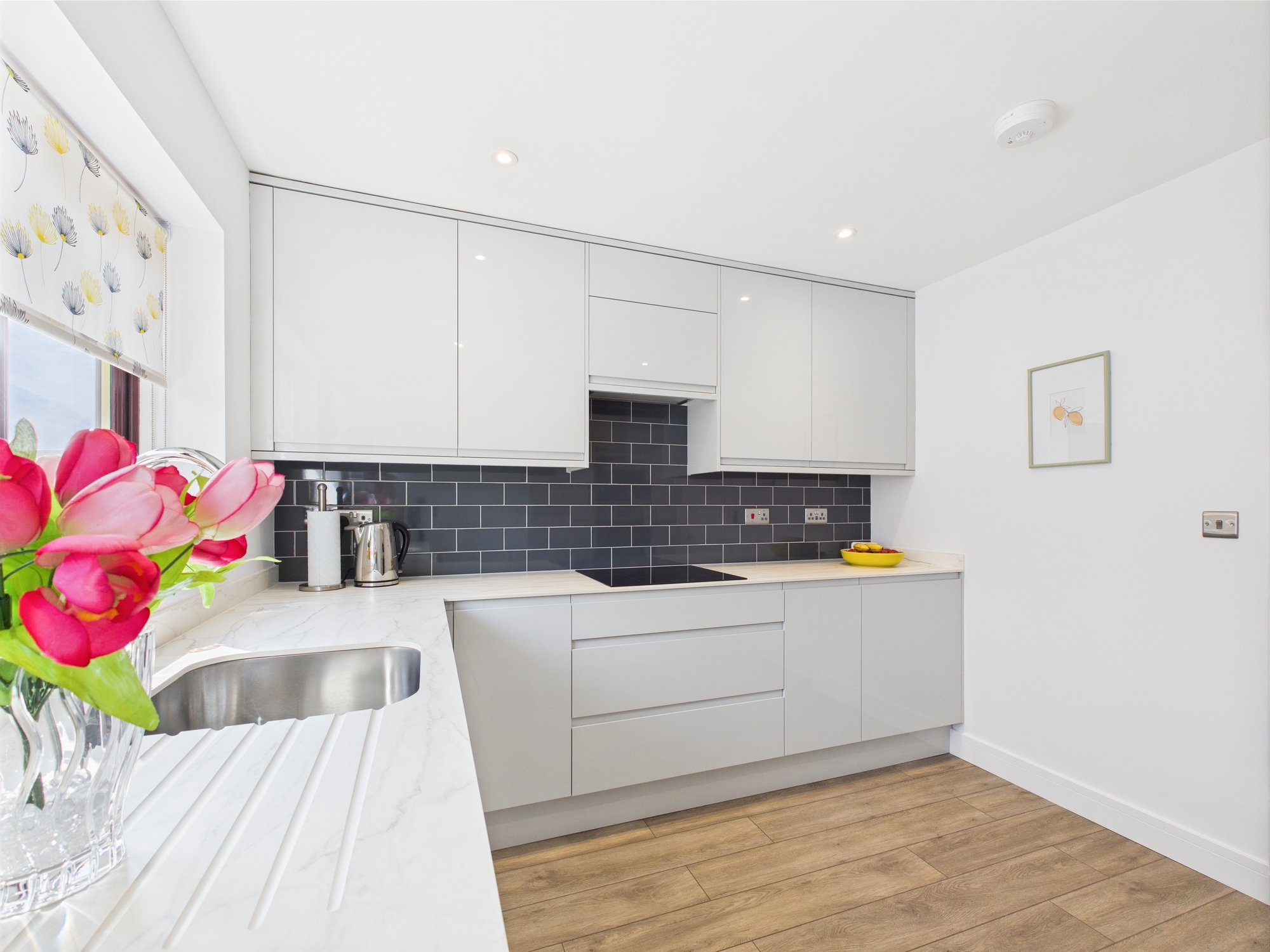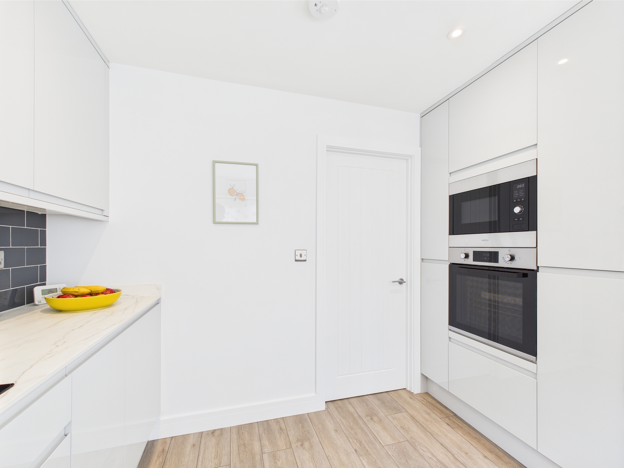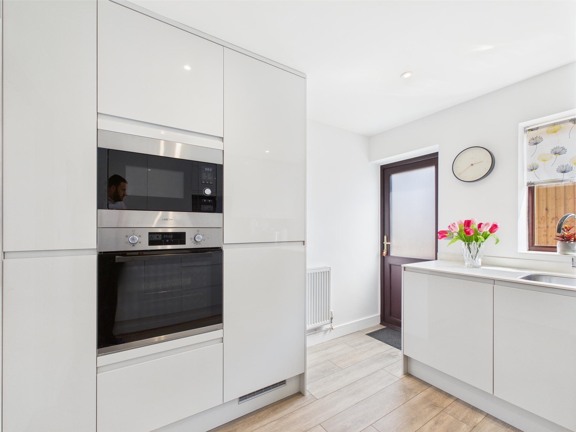 Matching wall and base units with worktop over, inset sink, induction hob with extractor over, integrated oven and microwave, dishwasher, washing machine and fridge/freezer, wall mounted radiator, uPVC double glazed window and door to side.