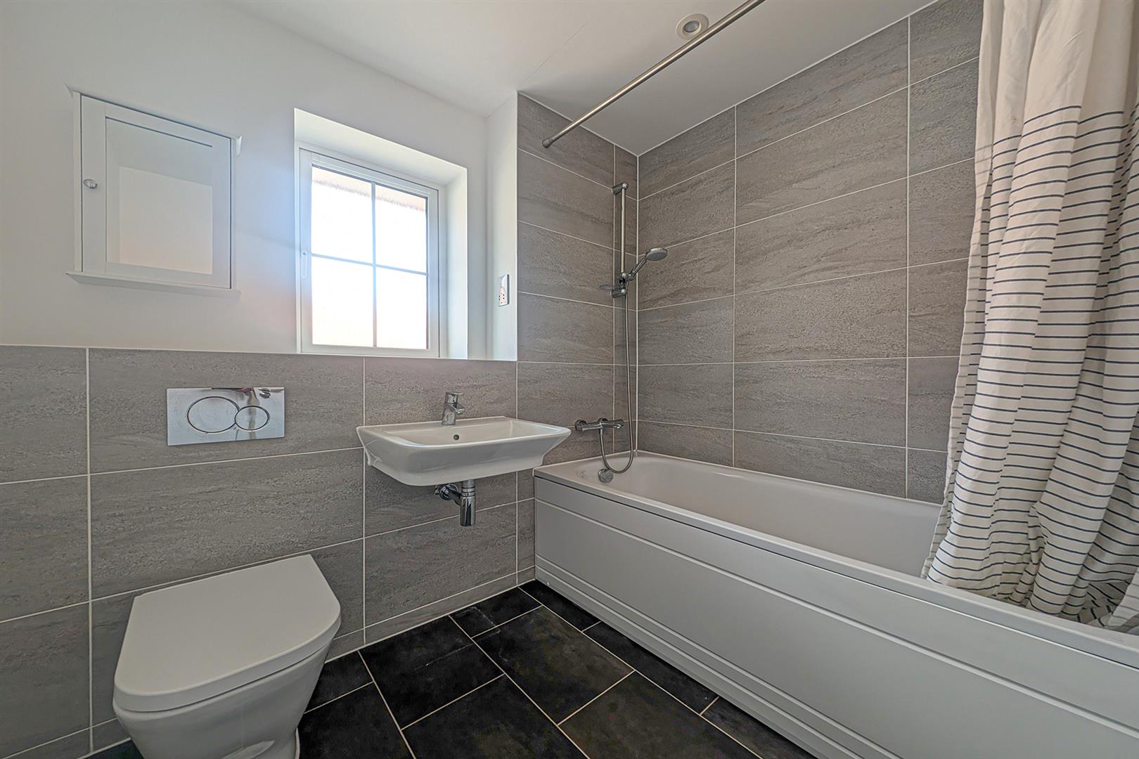 Contemporary bathroom with white suite comprising low level, concealed cistern, W.C., wall mounted hand basin with mixer tap over and panelled bath with wall mounted shower over. Obscured window. Attractively tiled. Door to landing.