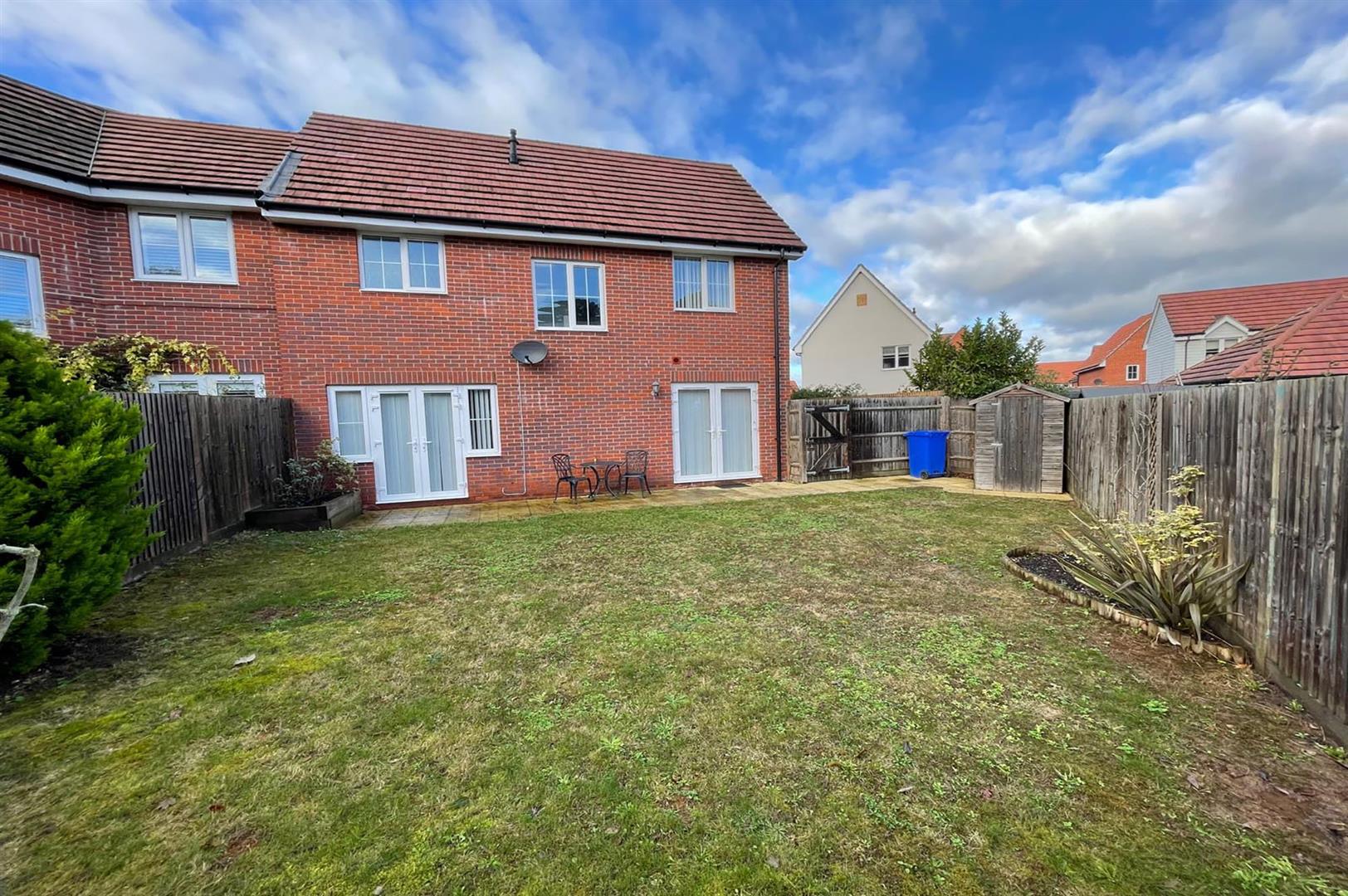 South-East facing garden, mainly laid to lawn with some border planting. Patio area to the rear of the house with two sets of French doors leading to the kitchen/dining room and living room. Timer shed. Access gate to the front.