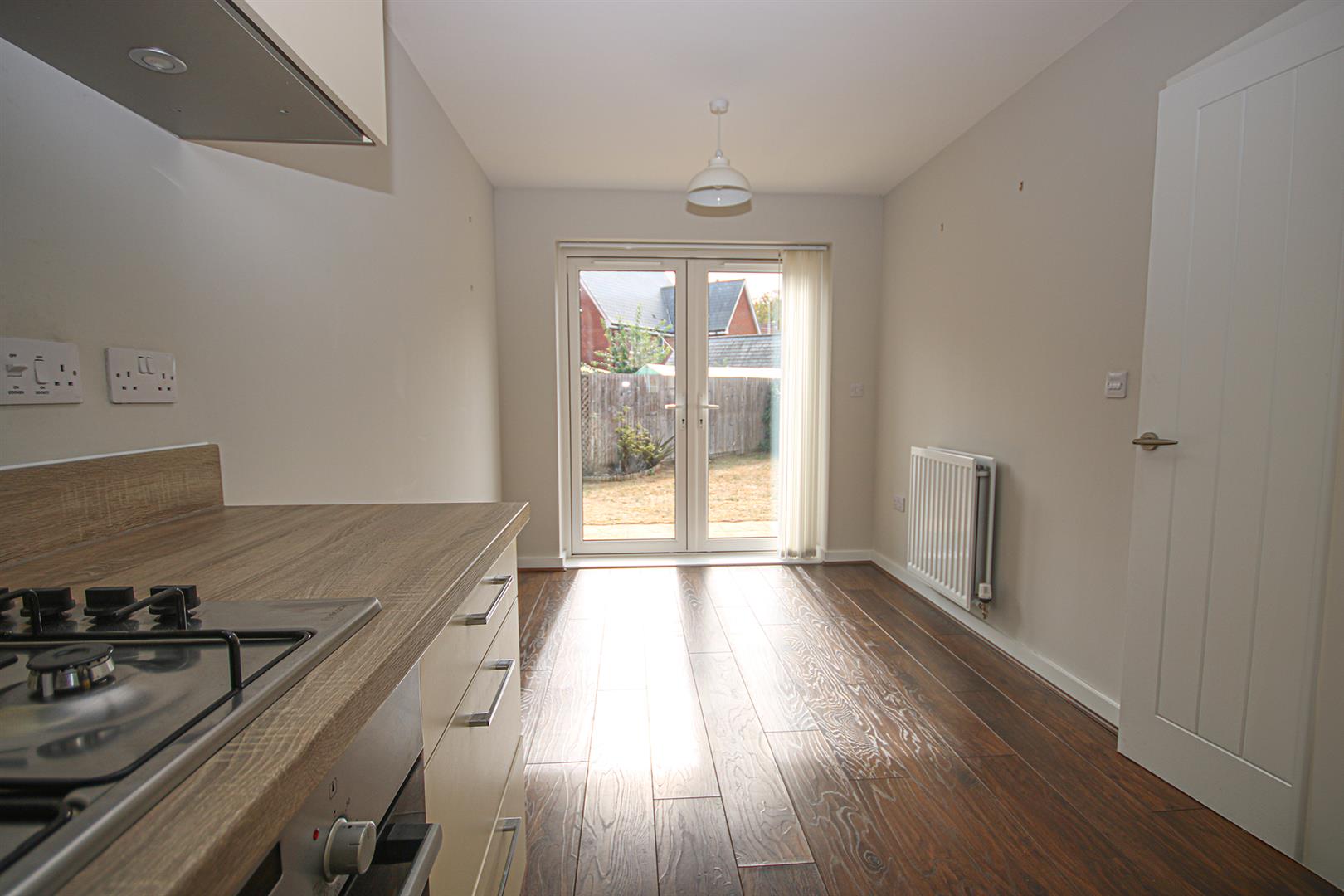 Contemporary kitchen/dining room with LVT wood flooring. Range of matching eye and base level cupboards with worktop over. Stainless steel sink and drainer with mixer tap over. Integrated oven with gas hob and extractor above. Integrated fridge/freezer. Space and plumbing for washing machine. French doors to the rear garden. Window to the front aspect. Radiator. Door to entrance hall.