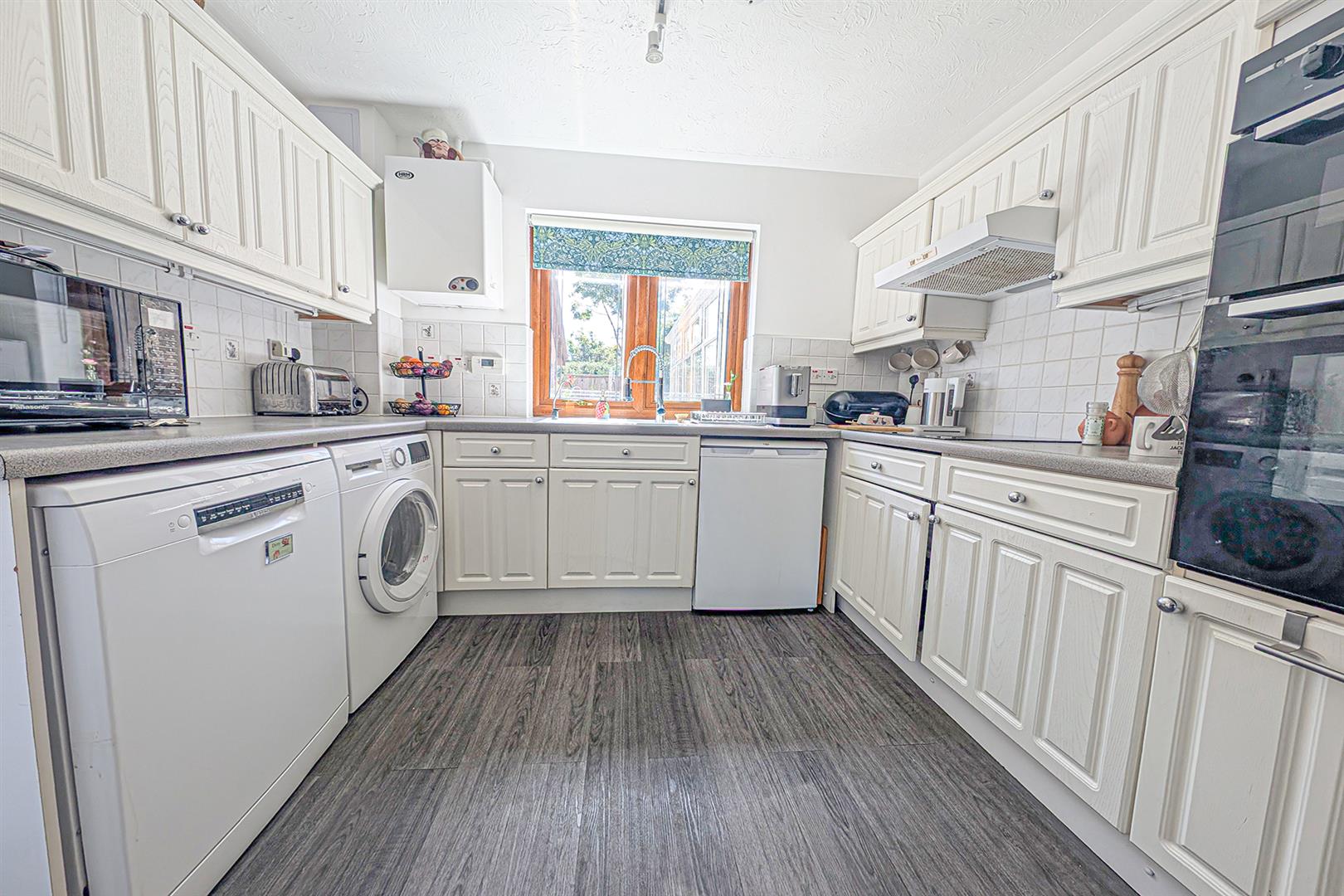 Modern kitchen with a range of matching eye and base level cupboards with worktop over. Tiled splashbacks. White composite sink and drainer with mixer tap over. Integrated eye level double oven. Inset electric hob with extractor over. Space and plumbing for washing machine and tumble dryer. Space for fridge. LVT wood flooring. Radiator. Window to rear aspect. Half glazed door to rear garden. Doors to entrance hall and dining room.