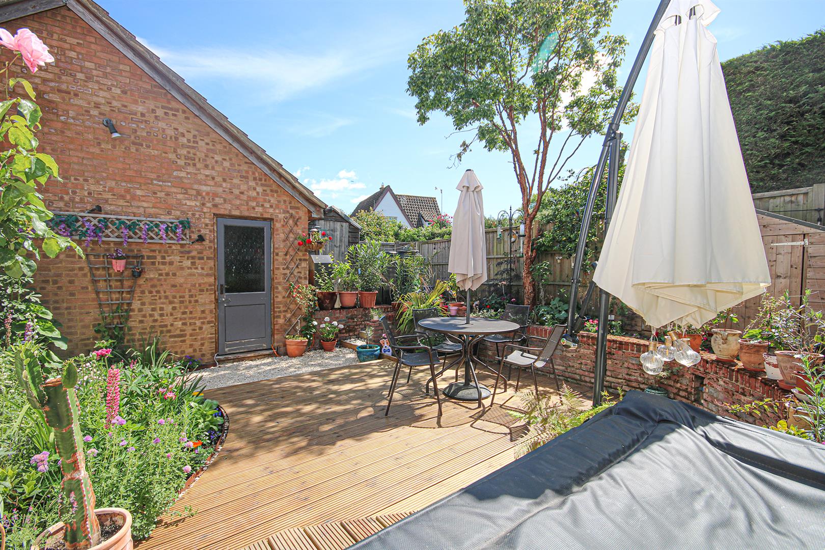 Delightful, private rear garden. Decked seating area with French doors to conservatory. Raised brick built beds with a variety of attractive planting. Gravel pathway leading to access gate to front and door to study. Steps leading to rear area with timber shed and oil tank.
