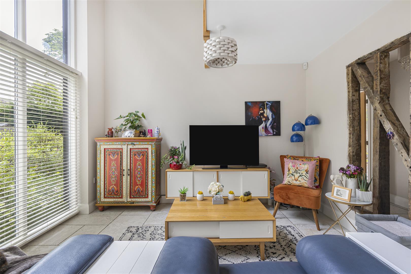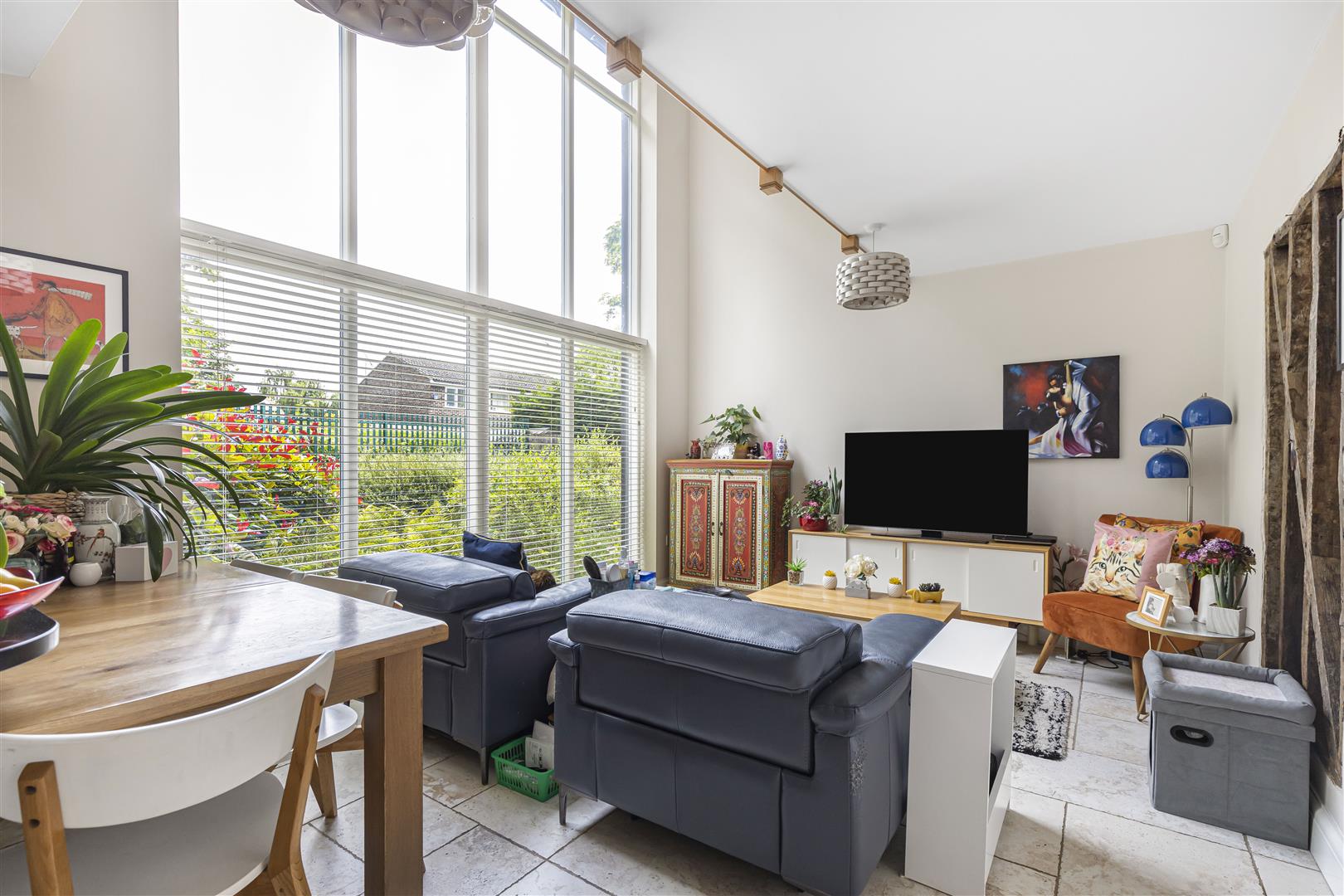 Opening through to the family room with feature full length windows covering from the floor to the top of the first floor. TV connection point and exposed timber beams.